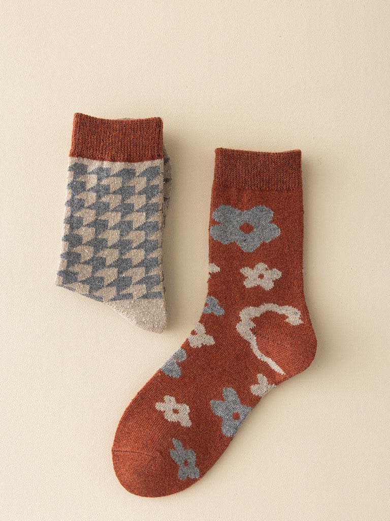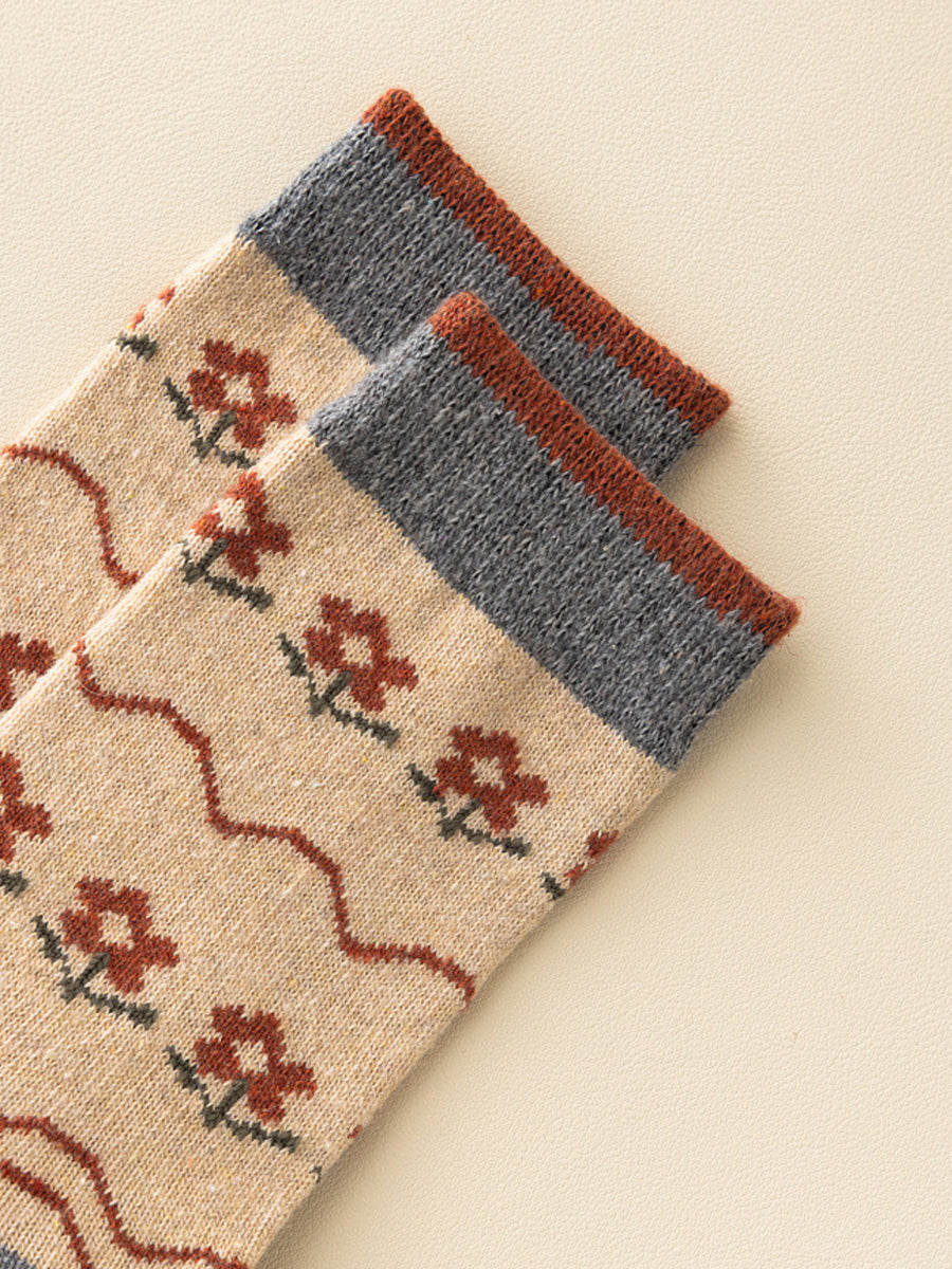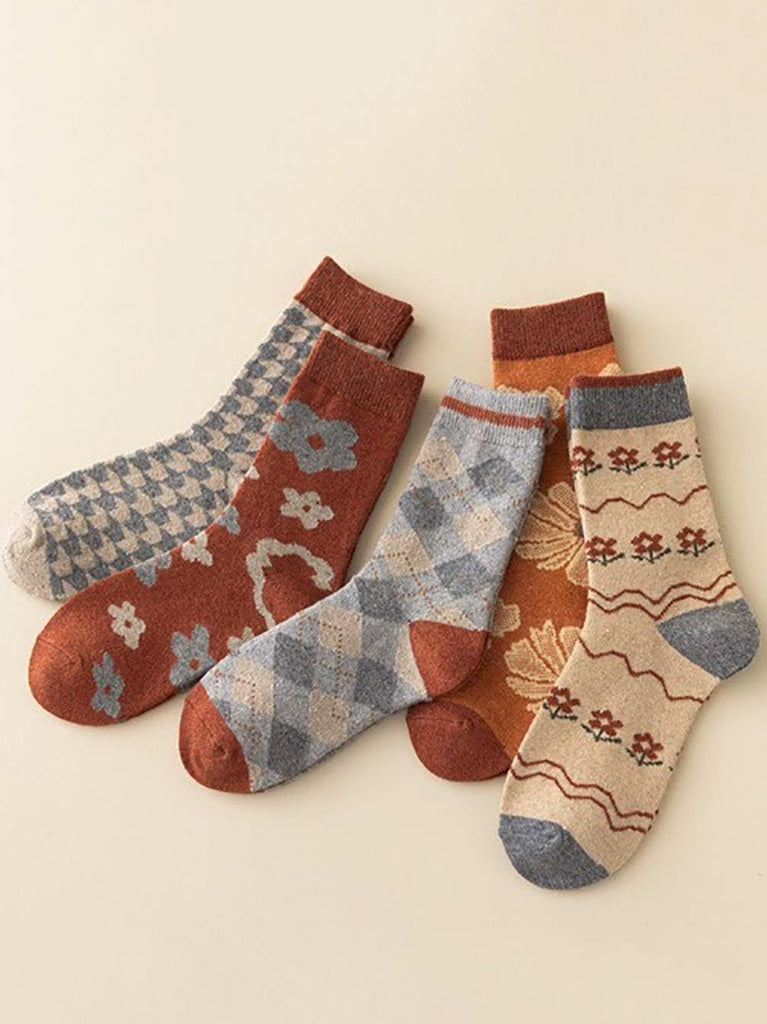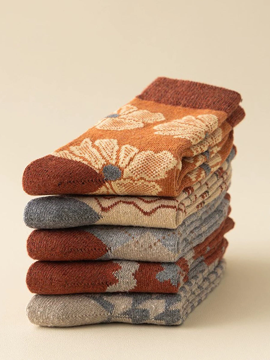5 Paar warme Damensocken mit Vintage-Blumenmuster