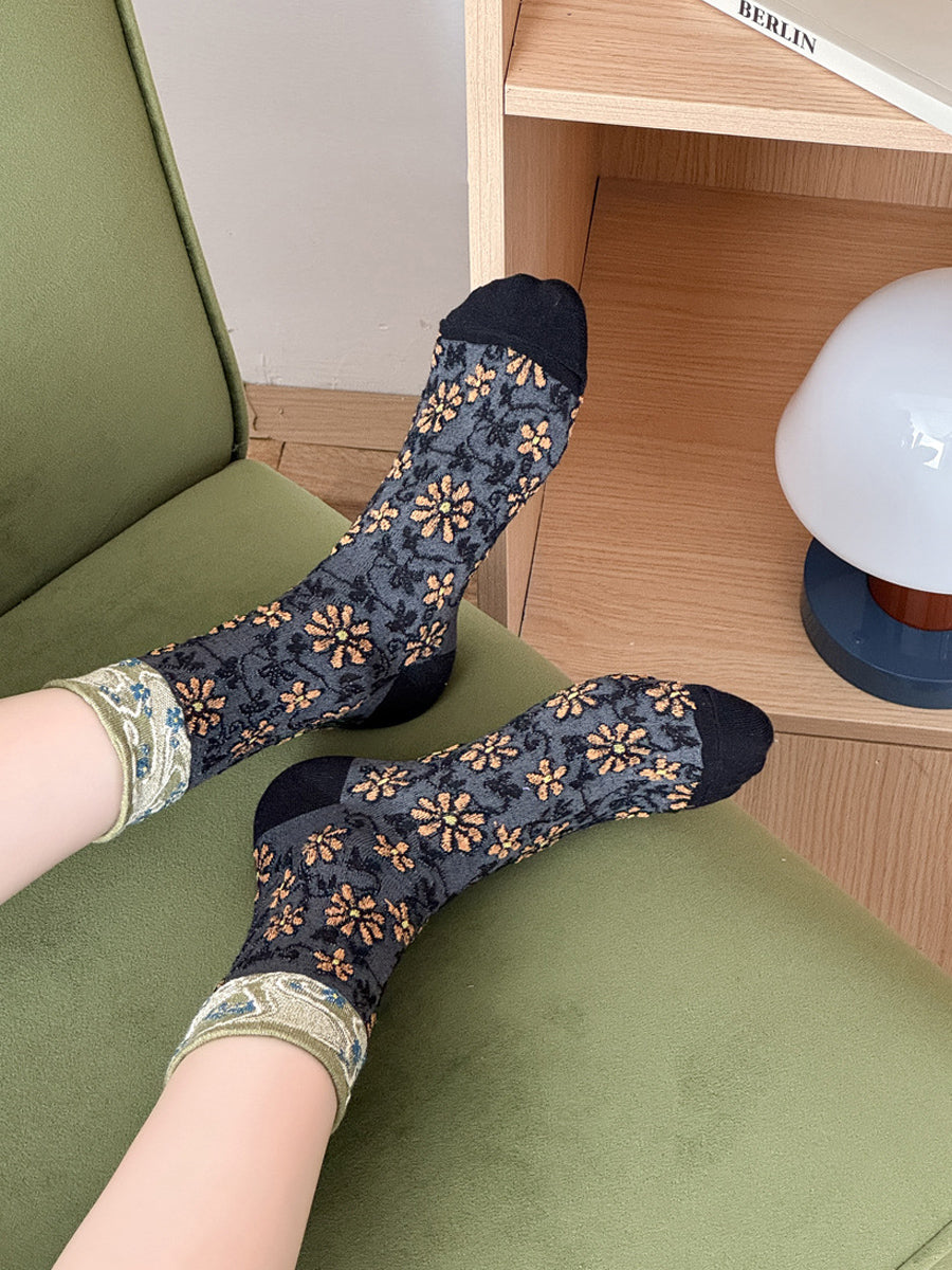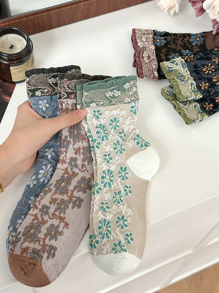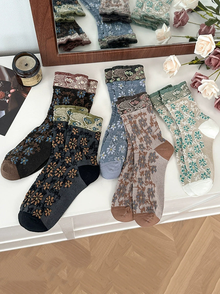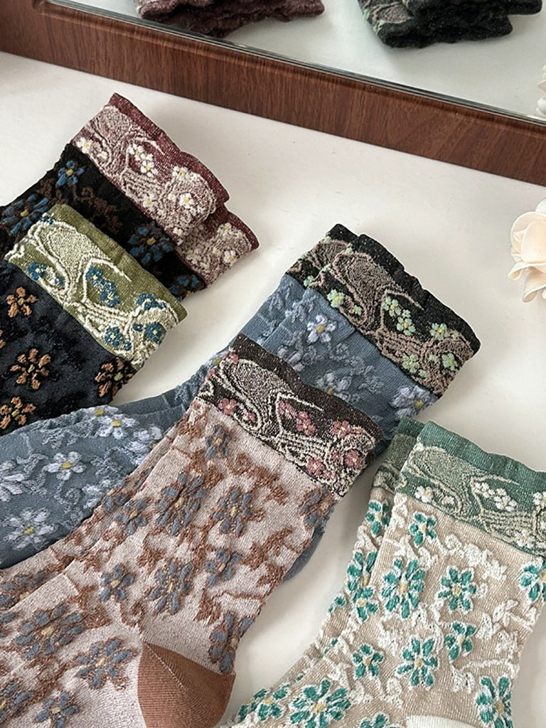 5 Paar Damen-Socken aus Baumwolle mit Vintage-Blumenmuster und Jacquard-Print