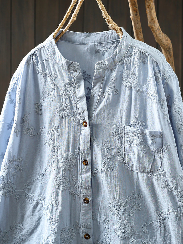 Damen Sommerhemd mit künstlerischer Blumenstickerei und V-Ausschnitt aus 100 % Baumwolle