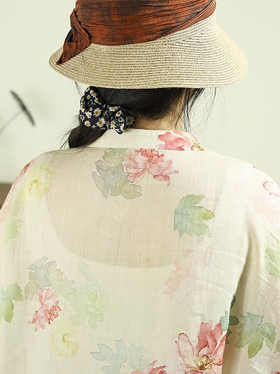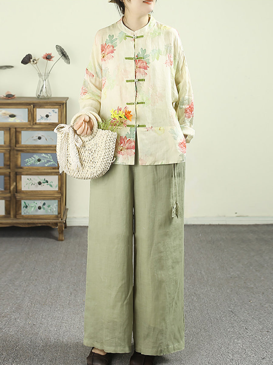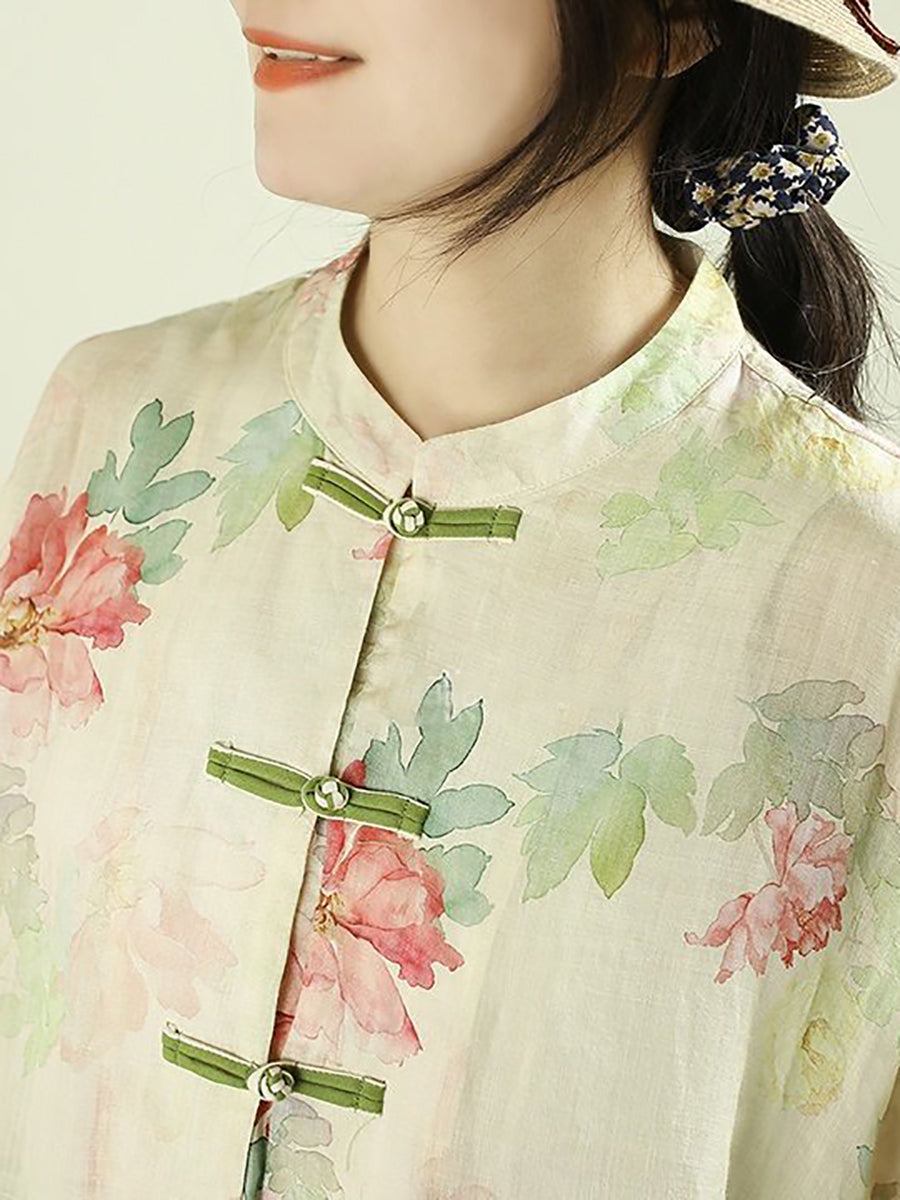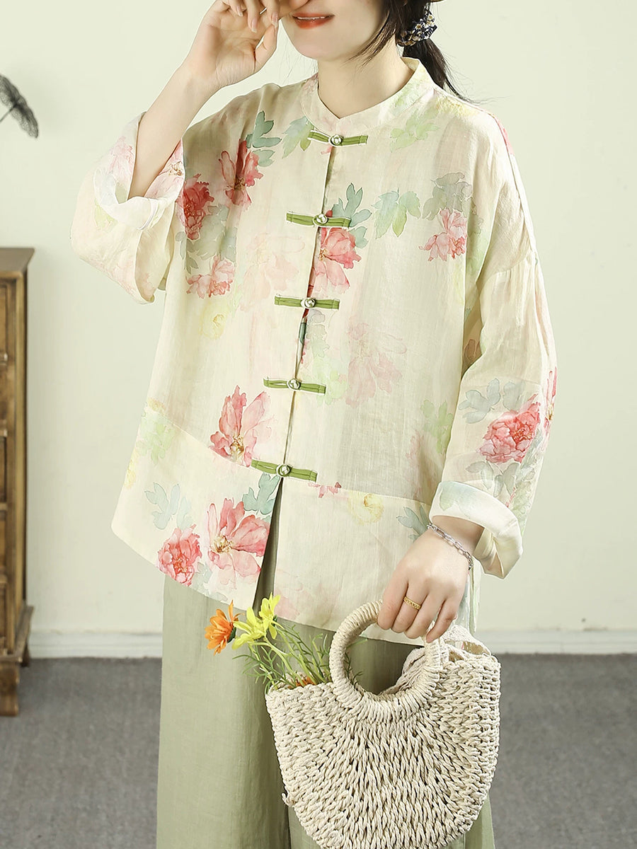Damen-Ethno-Frühlingsbluse mit Stehkragen und Blumenmuster aus 100 % Ramie