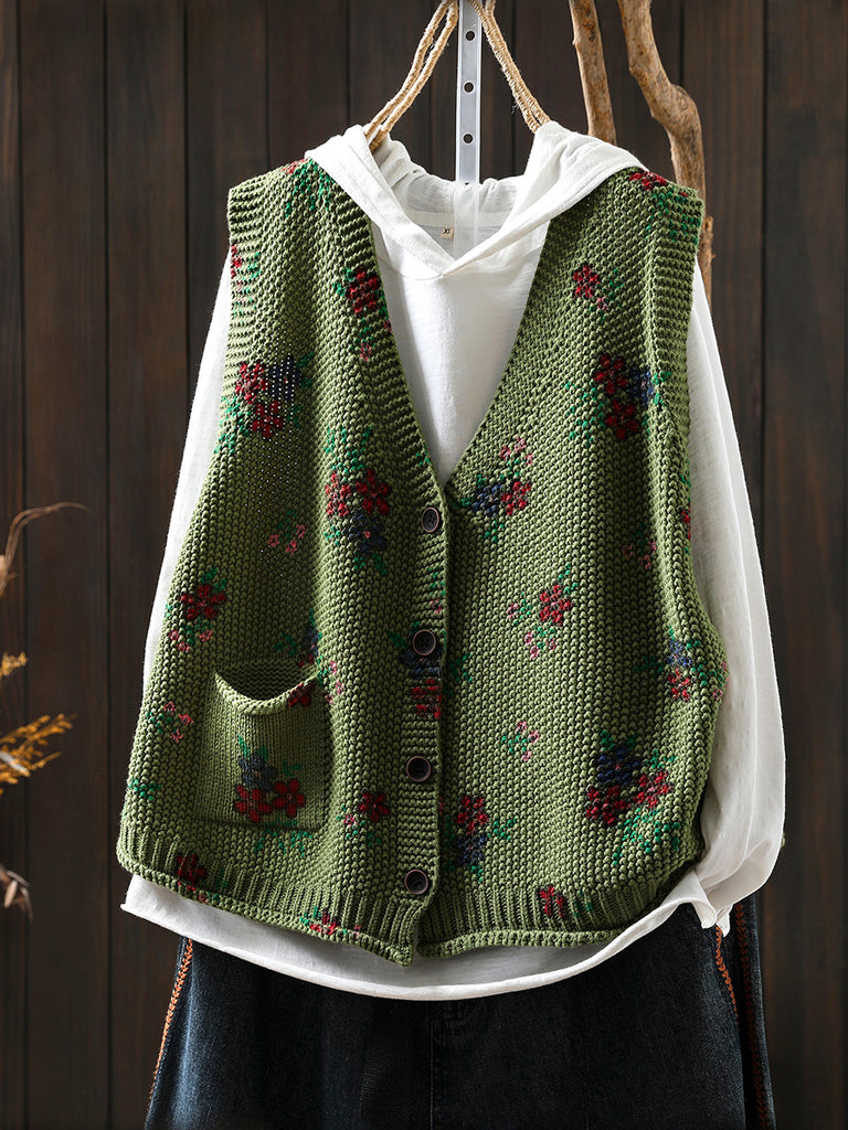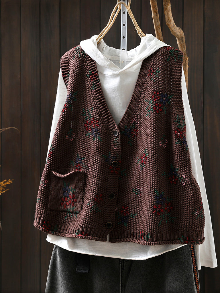 Damen Herbst Retro Floral V-Ausschnitt Strickweste