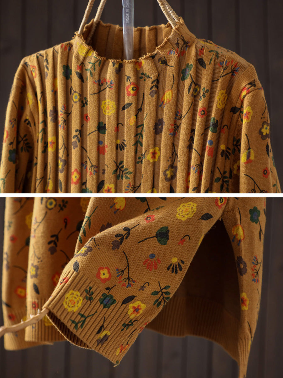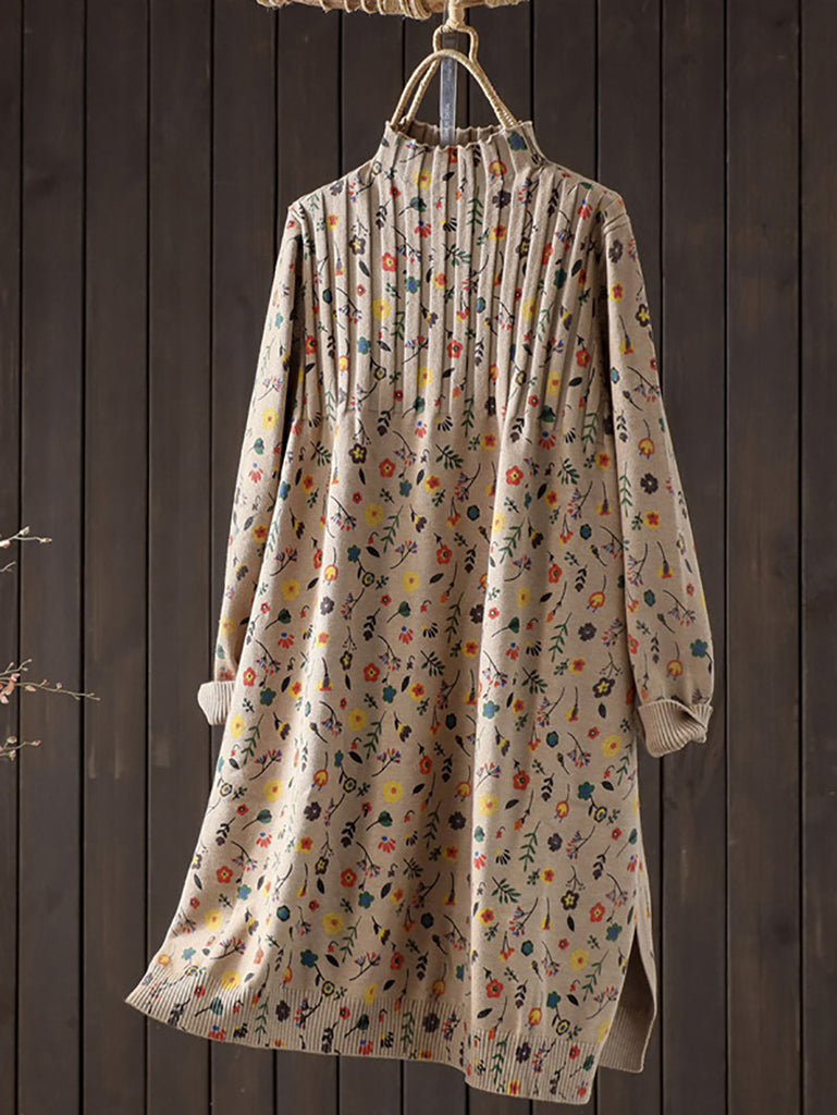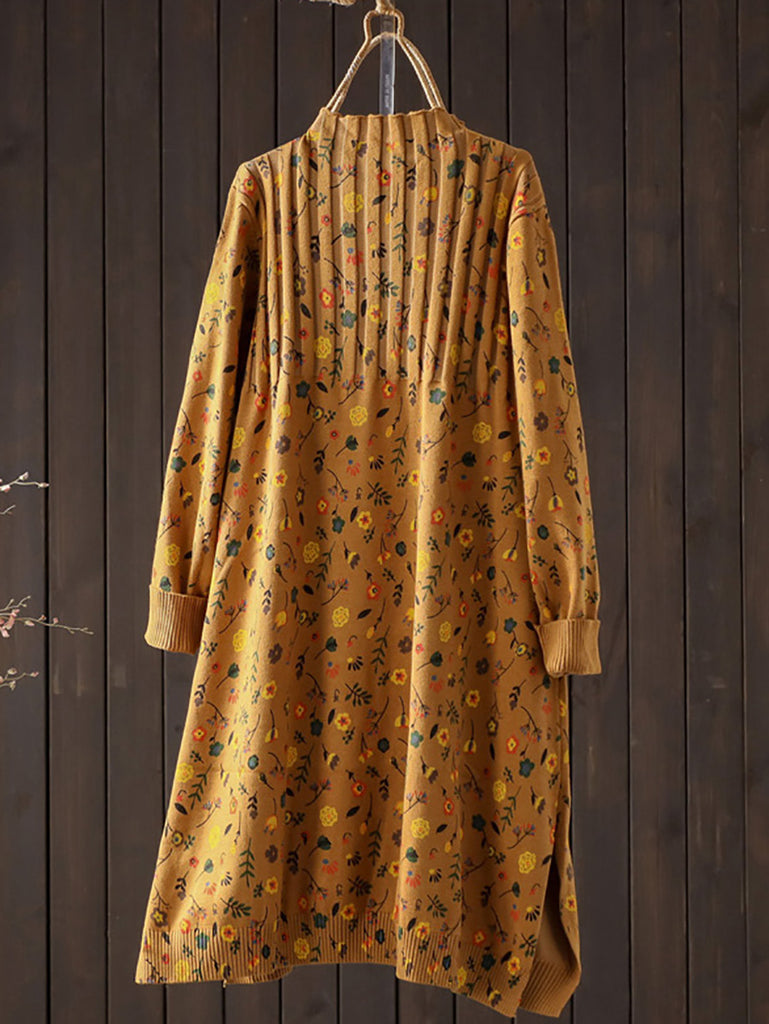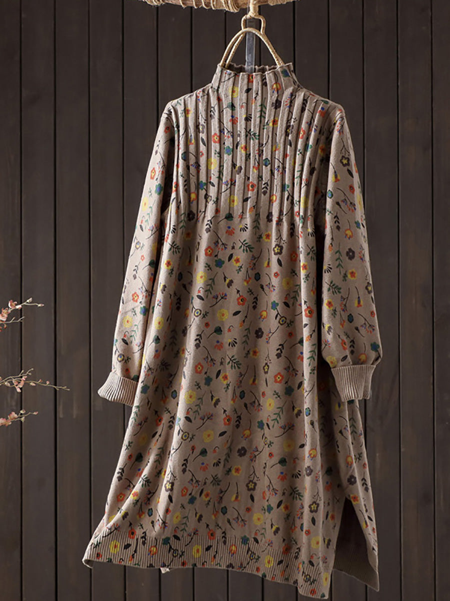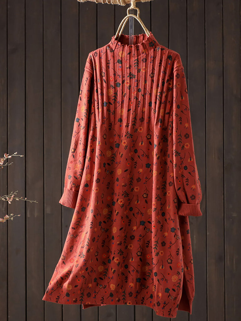 Damen Herbst Vintage Blumen Halbkragen Strickkleid