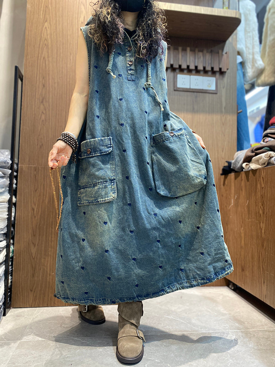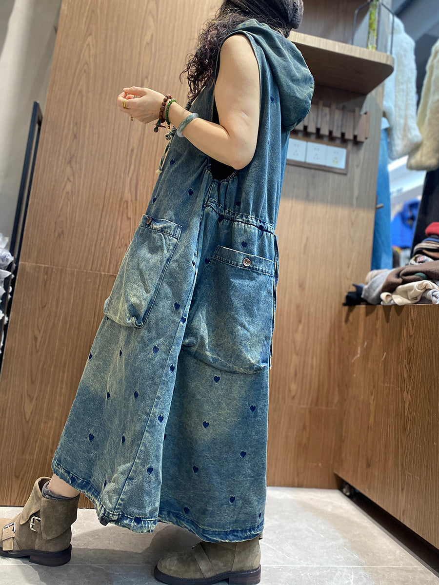 Damen Frühlingskleid mit Herzstickerei, Jeans-Kapuzenweste, Kleid
