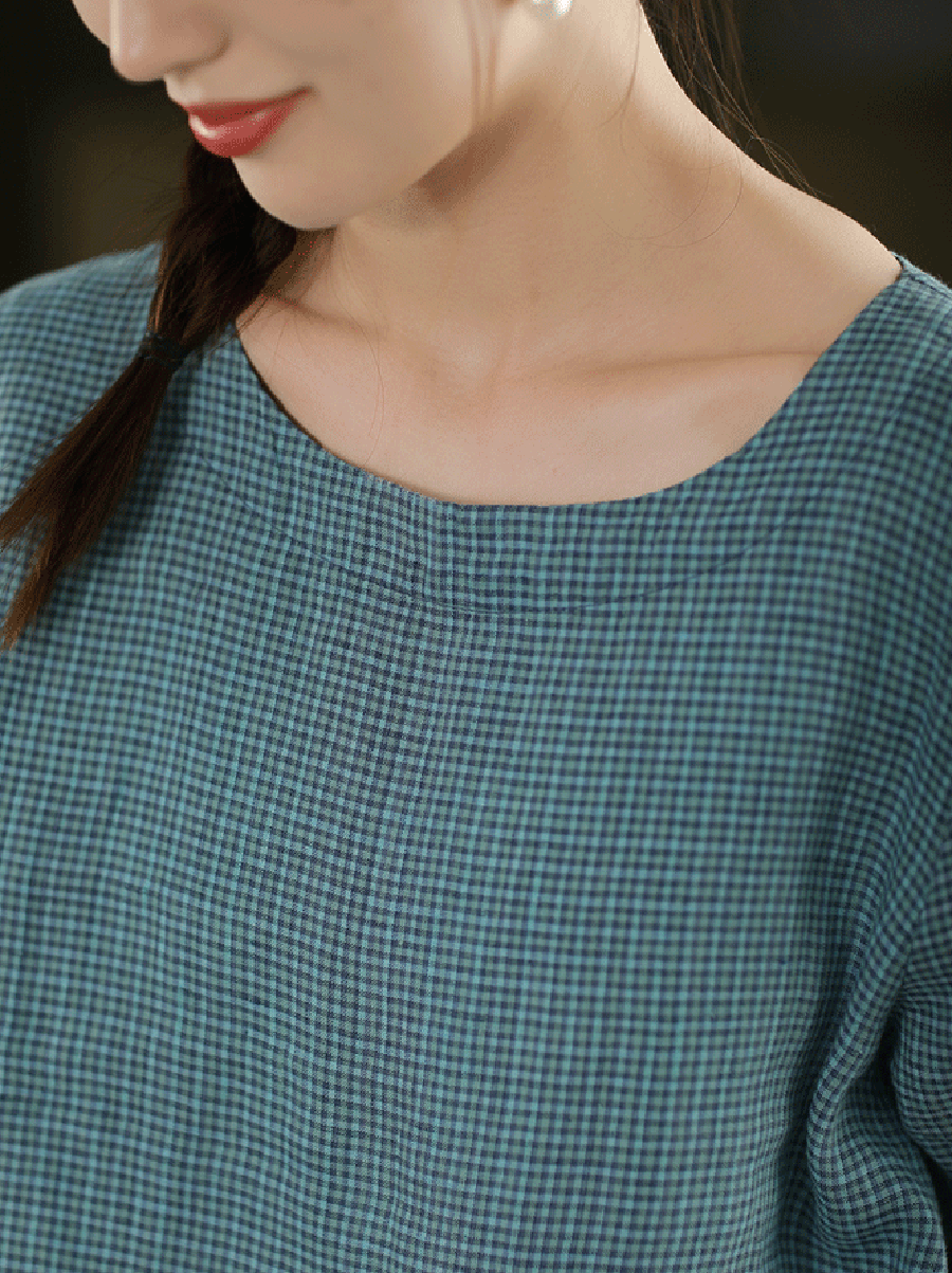 Damen Sommer Vintage Plaid O-Ausschnitt 100% Leinen Kleid