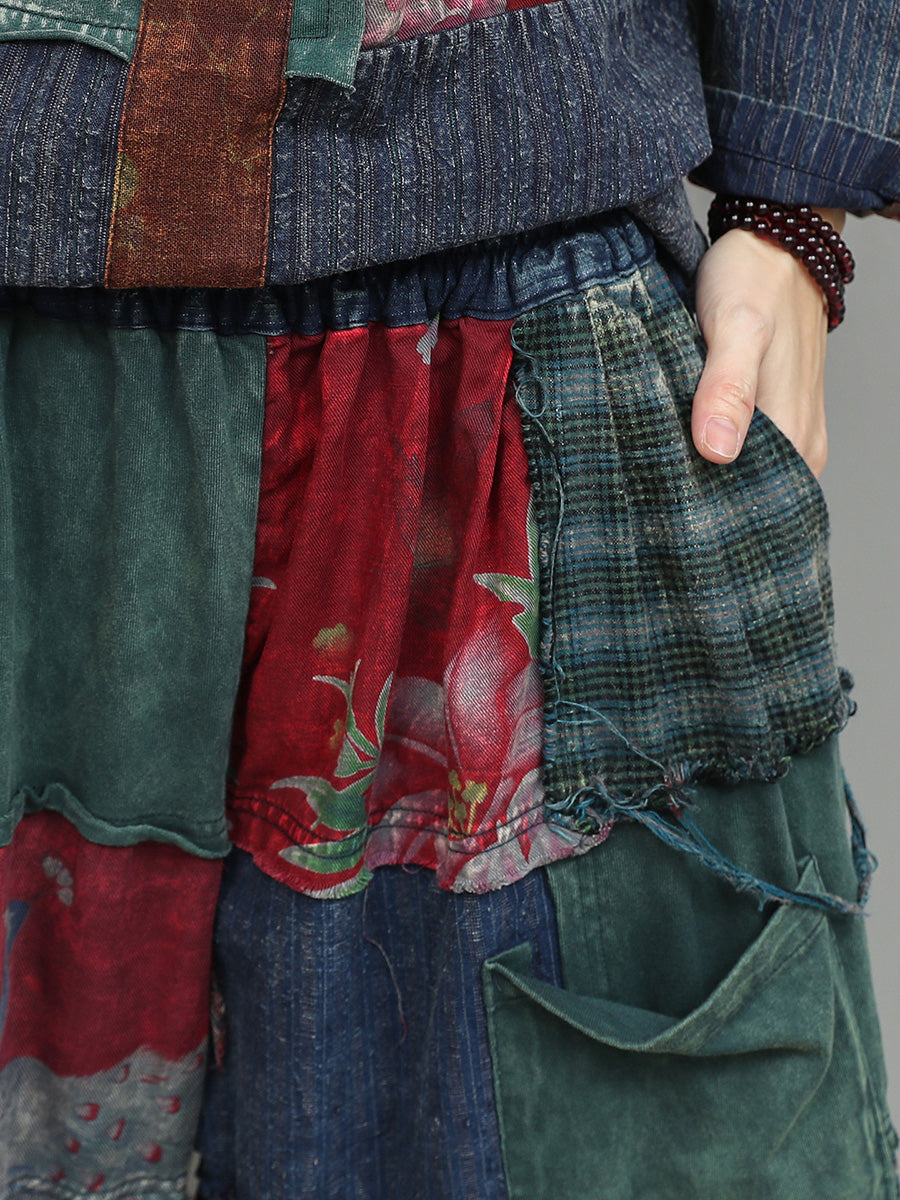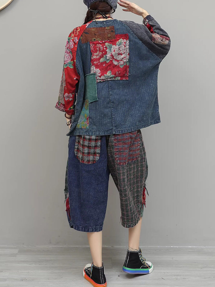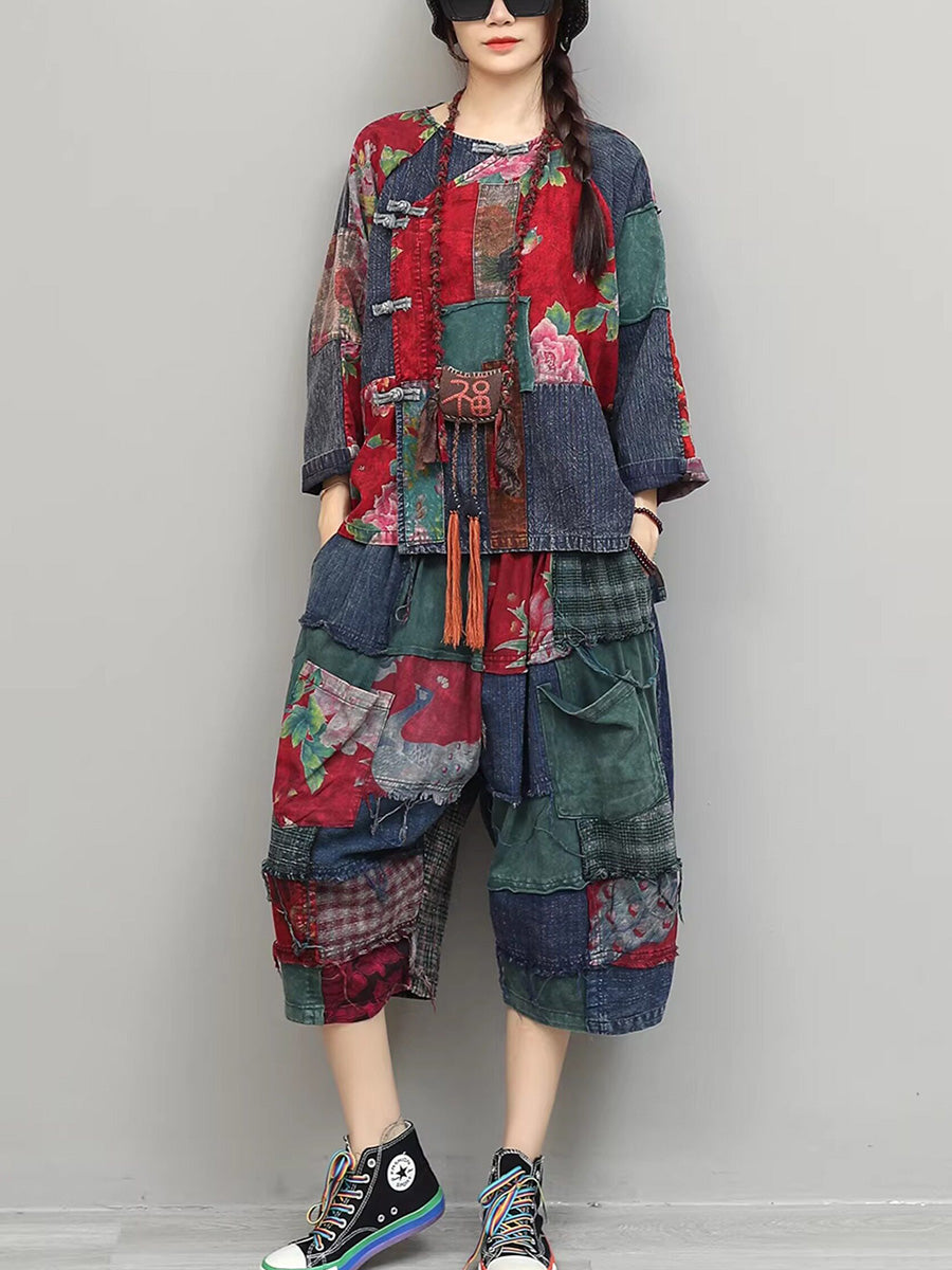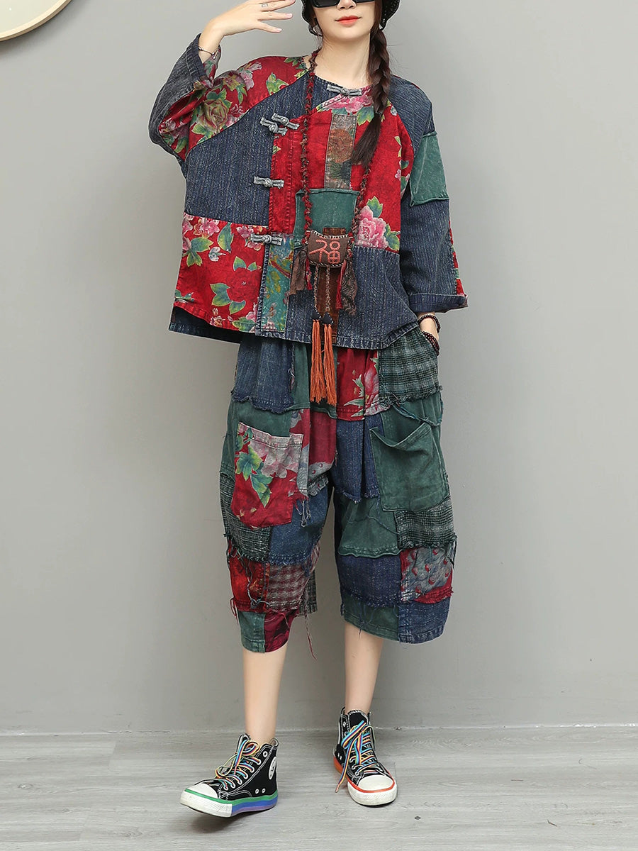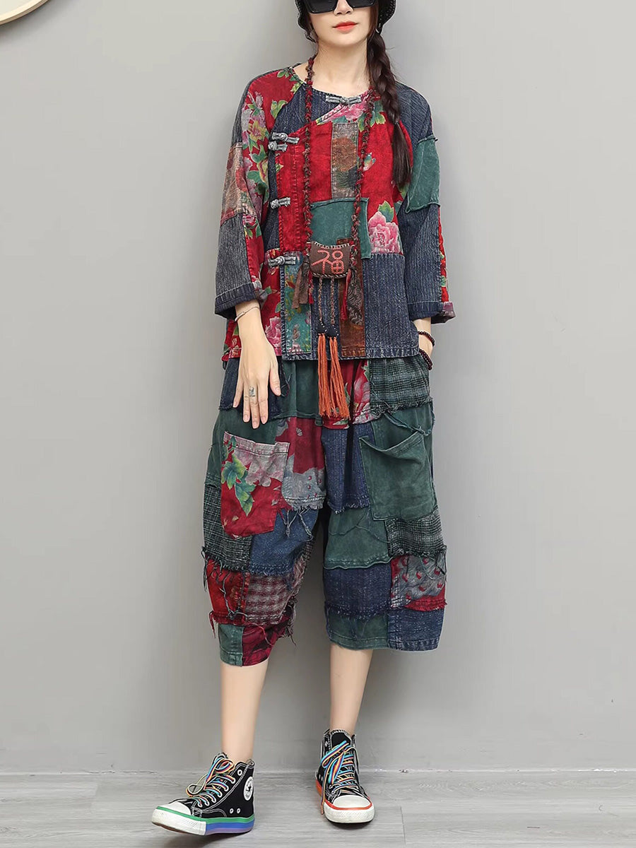 Sommeranzüge für Damen mit ethnischem Blumenmuster und Patchwork