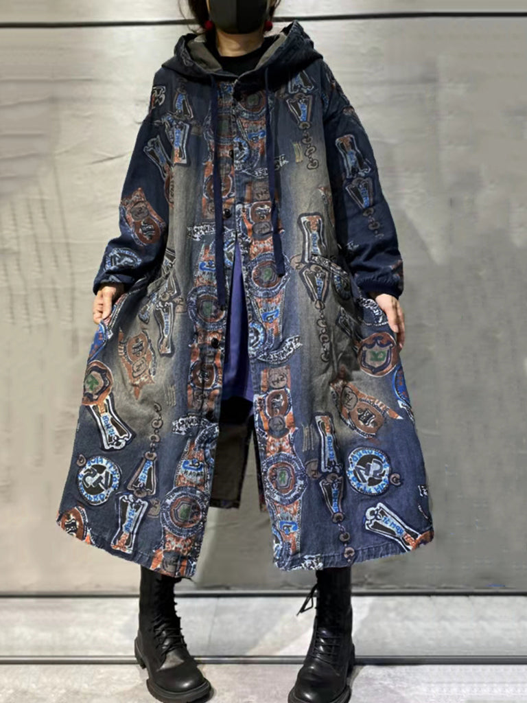 Damen Herbst Vintage Blumen Fester Kapuzen Langer Mantel