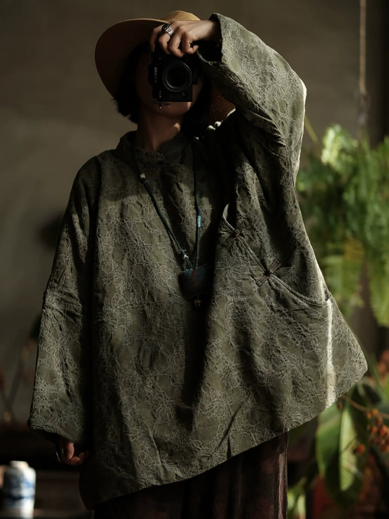 Damen Ethnischer Herbst Blumen Patch O-Ausschnitt Baumwollmantel