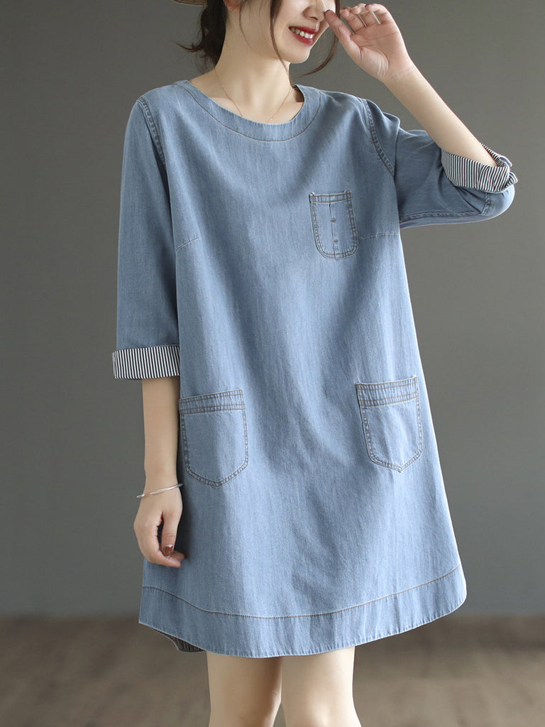 Frauen Sommer Retro Tasche Lose Feste Denim Kleid