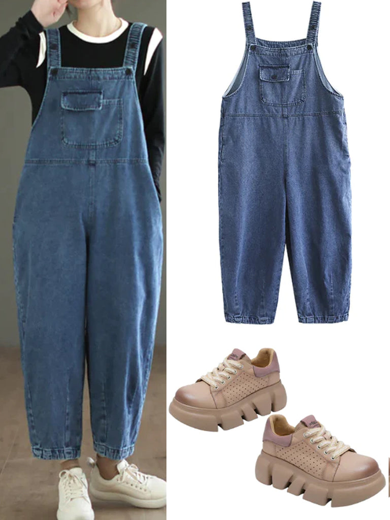 Damen Herbst Retro Pure Color Denim Spliced Haremshose