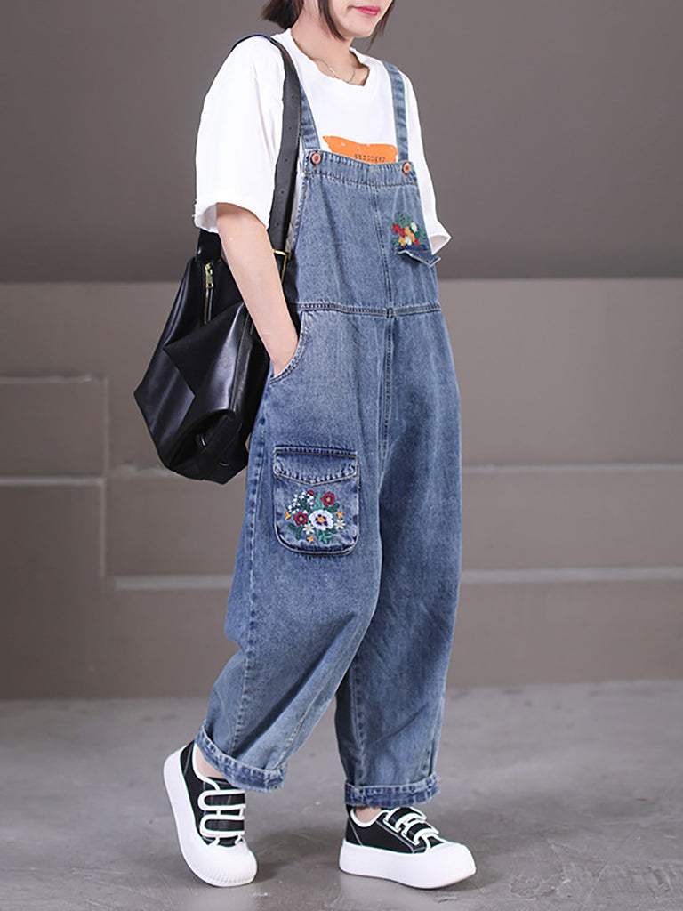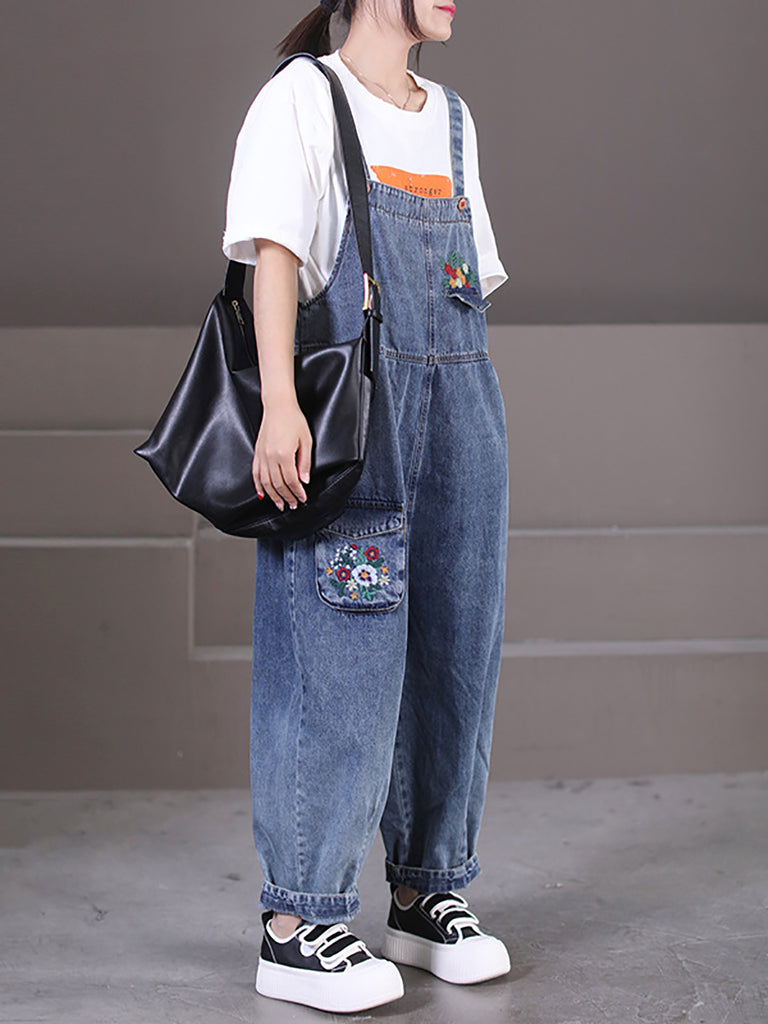 Damen Retro Frühlingsblumen Stickerei Denim Haremshose