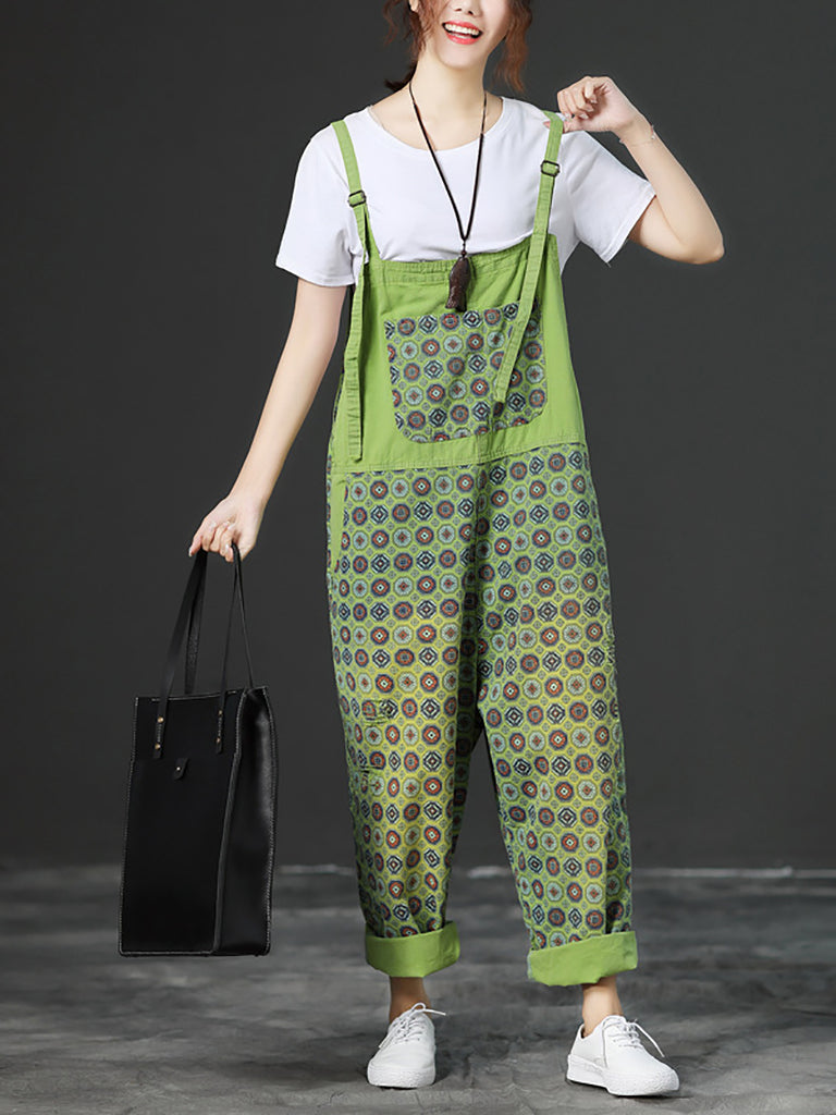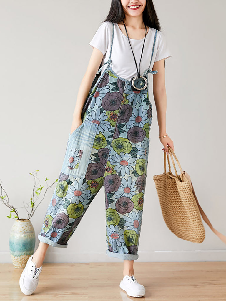 Frauen Sommer Artsy Blumendruck Tasche Lose Denim Overalls