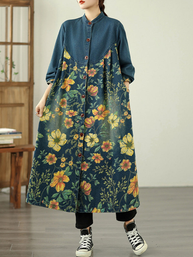 Damen Herbst Denim Blumen Stehkragen Mantel