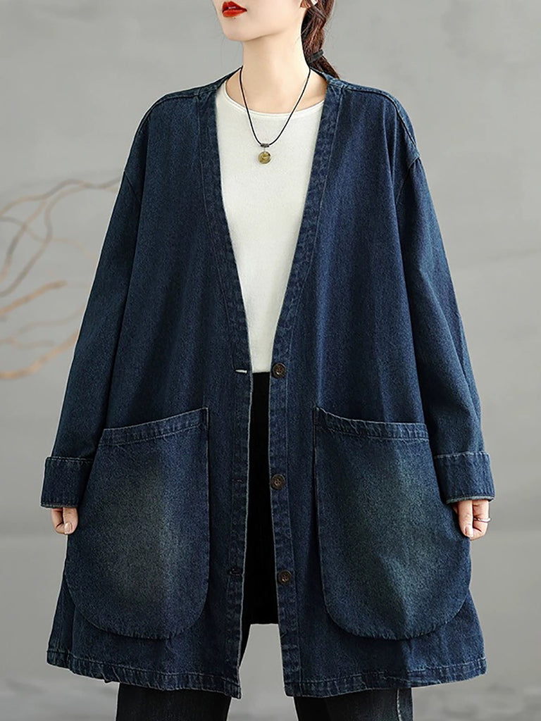 Damen Vintage Herbst Pure Color Denim V-Ausschnitt Mantel