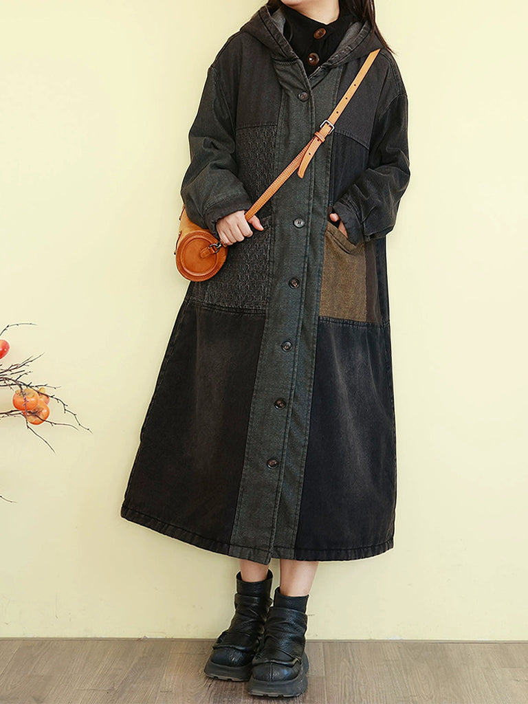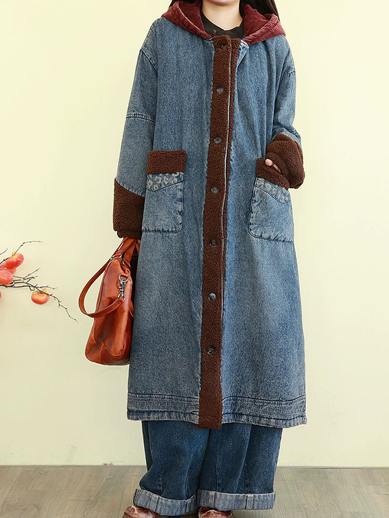Damen Winter Retro Colorblock Denim Kapuzen-Wattierter Mantel