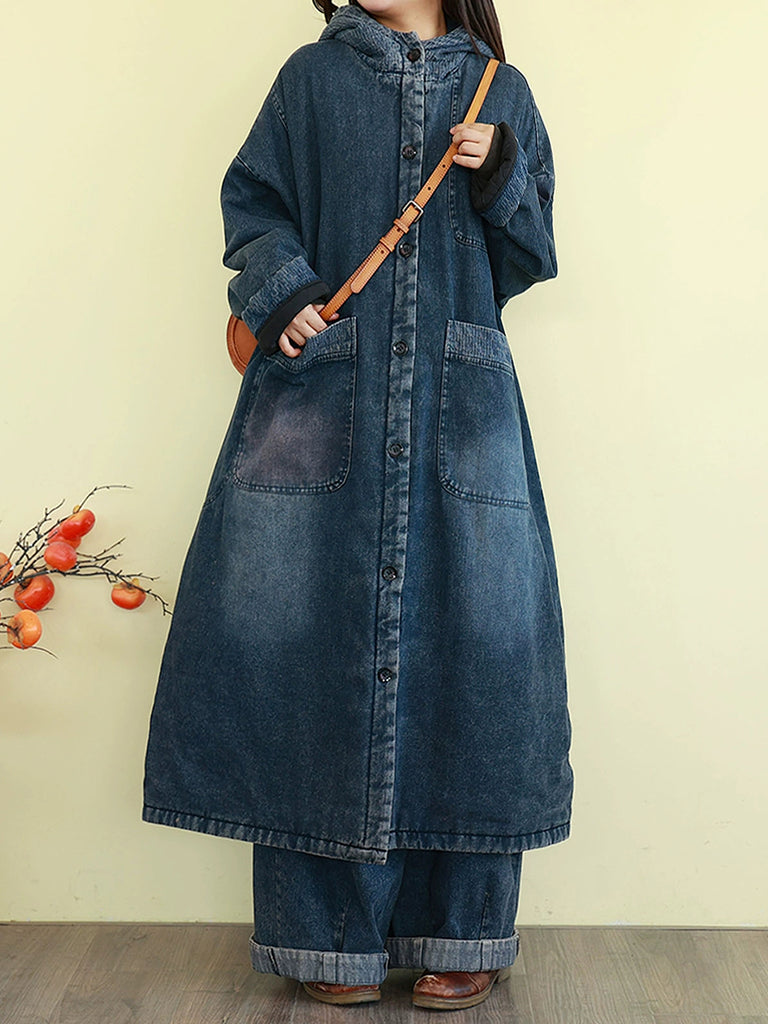 Damen Wintermantel Vintage Jeansstoff mit Steppung und Kapuze