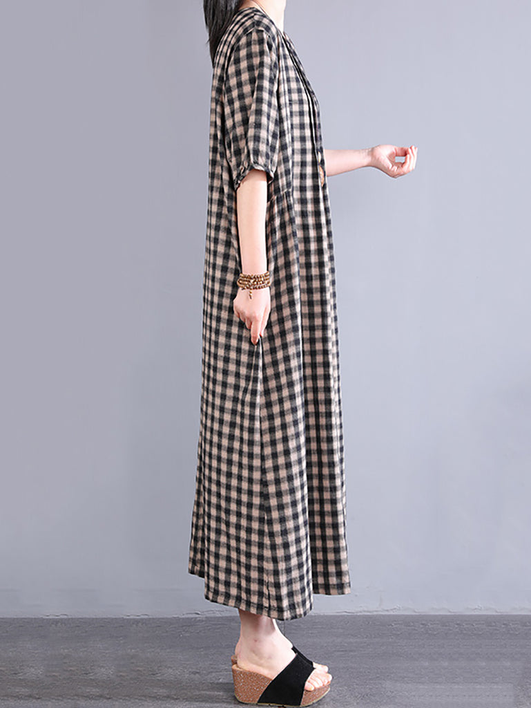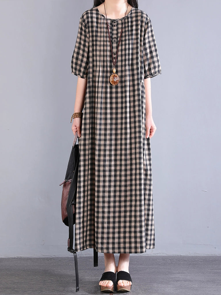 Übergröße, verschiedenfarbiges kariertes Retro-Kleid aus Baumwollleinen