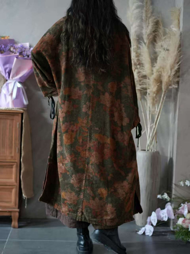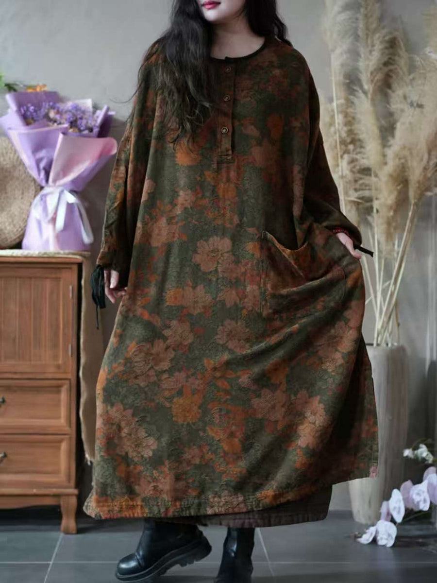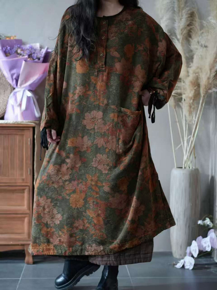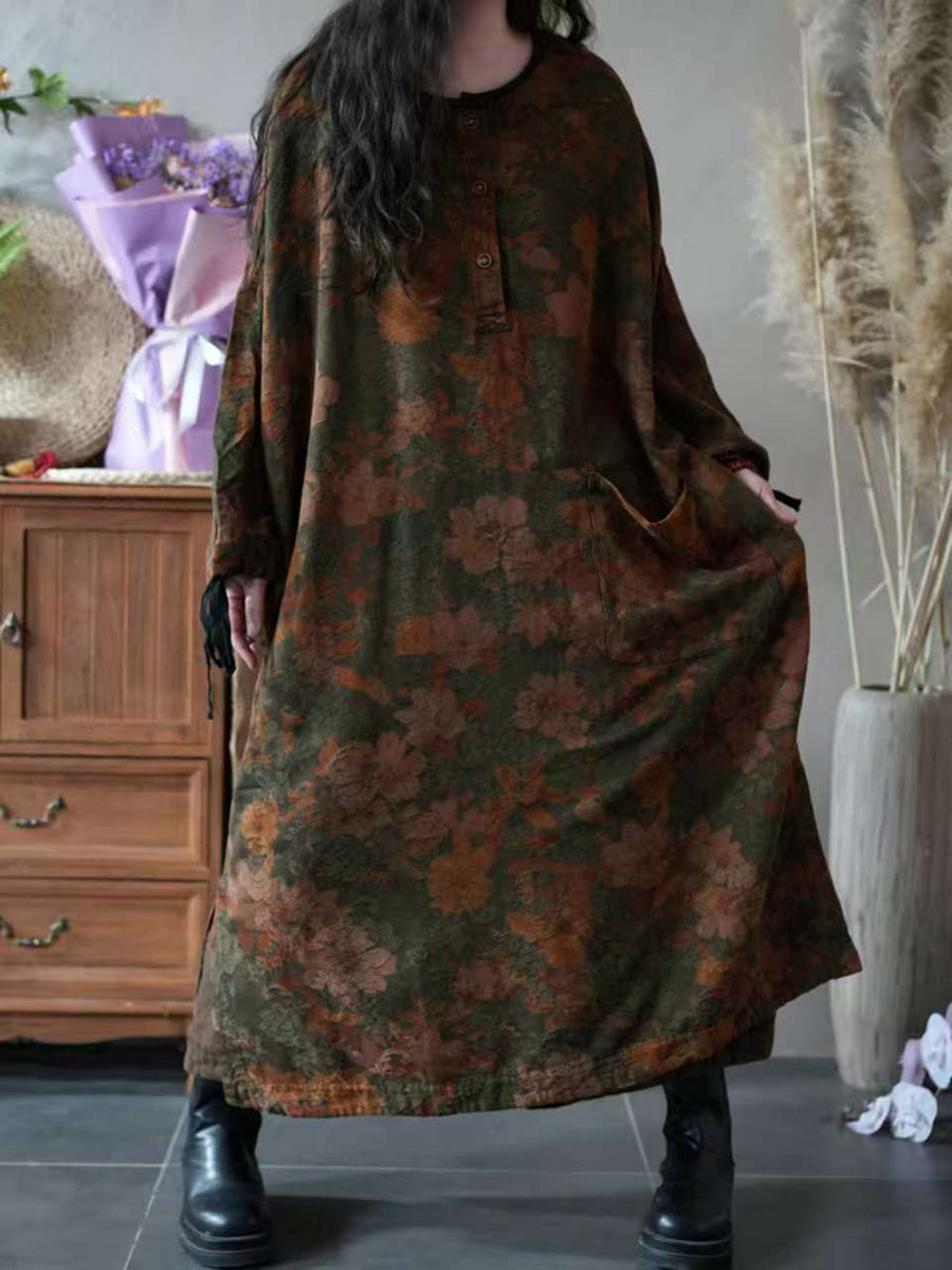 Damen Herbst Vintage Blumen O-Ausschnitt Kleid