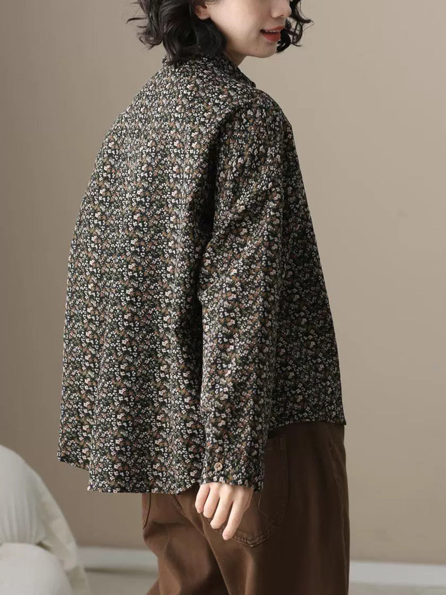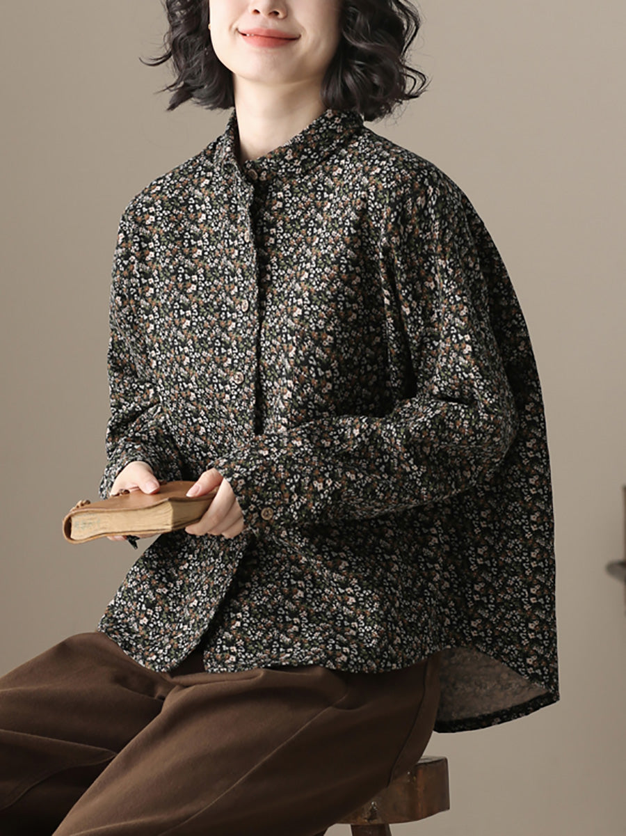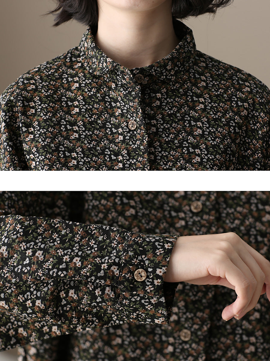 Damenbluse aus Baumwolle mit künstlerischem Herbstblumenmuster und Umlegekragen