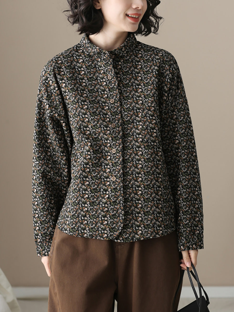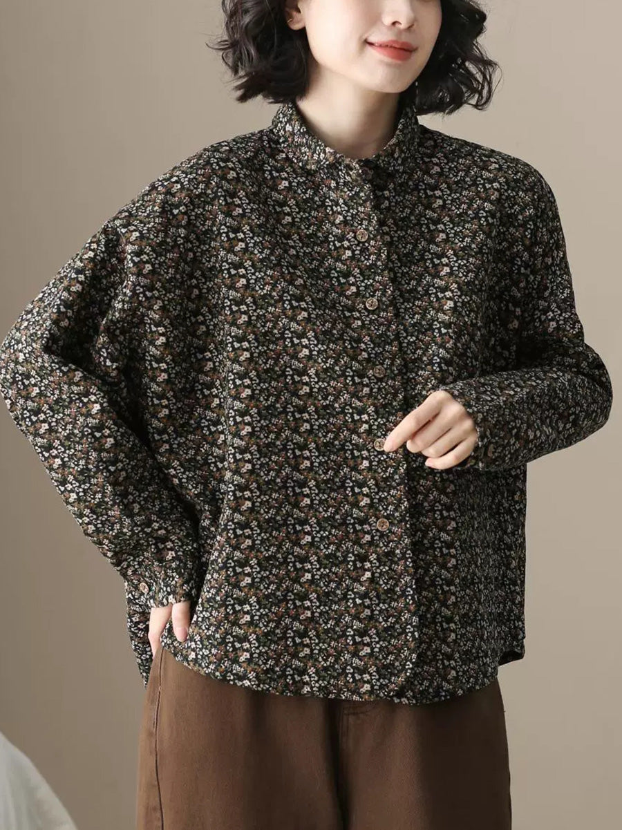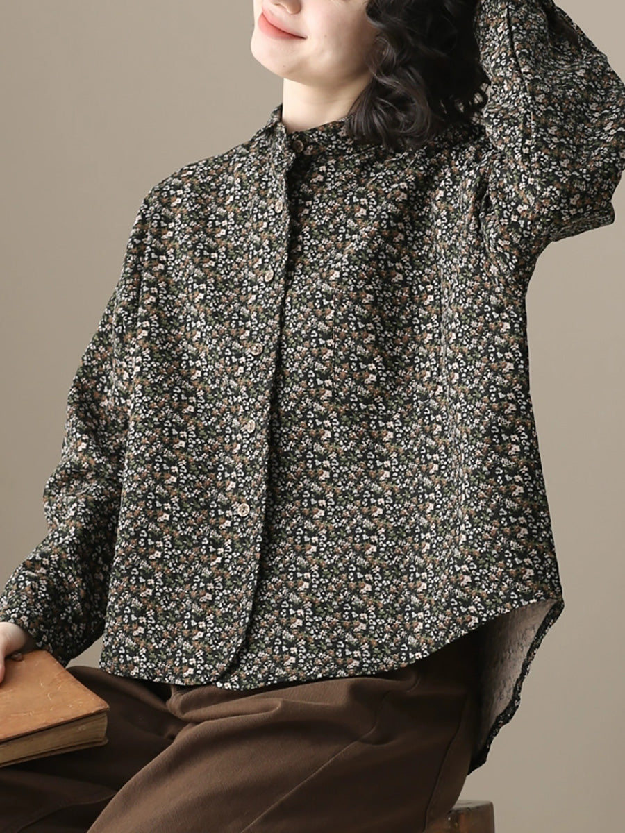 Damenbluse aus Baumwolle mit künstlerischem Herbstblumenmuster und Umlegekragen