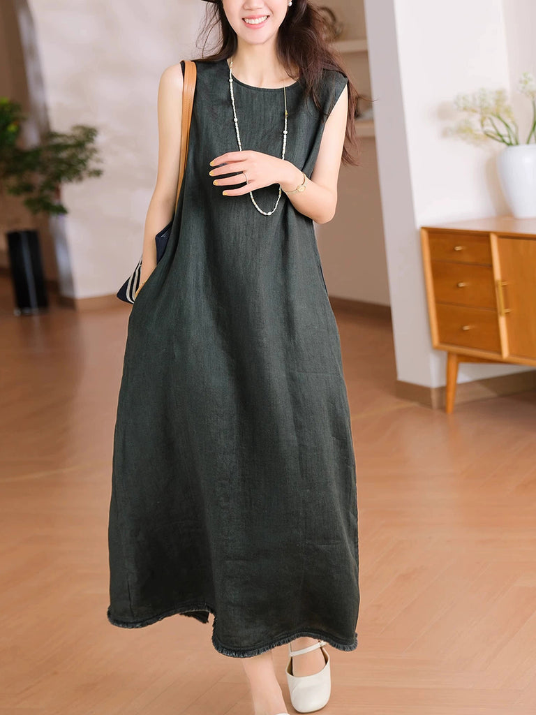 Damen Sommer Casual Pure Color O-Ausschnitt 100% Leinen Kleid
