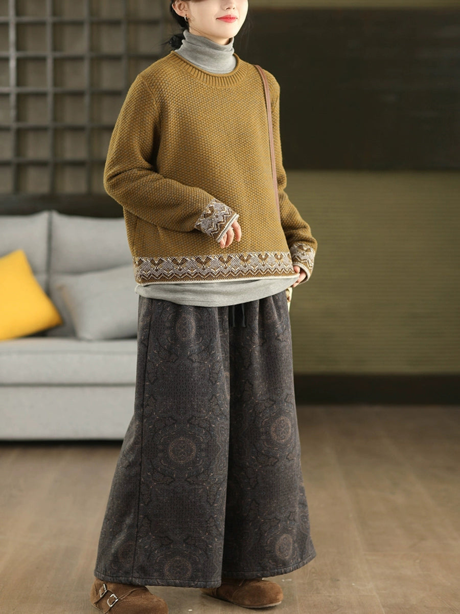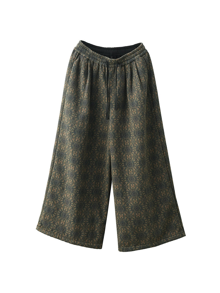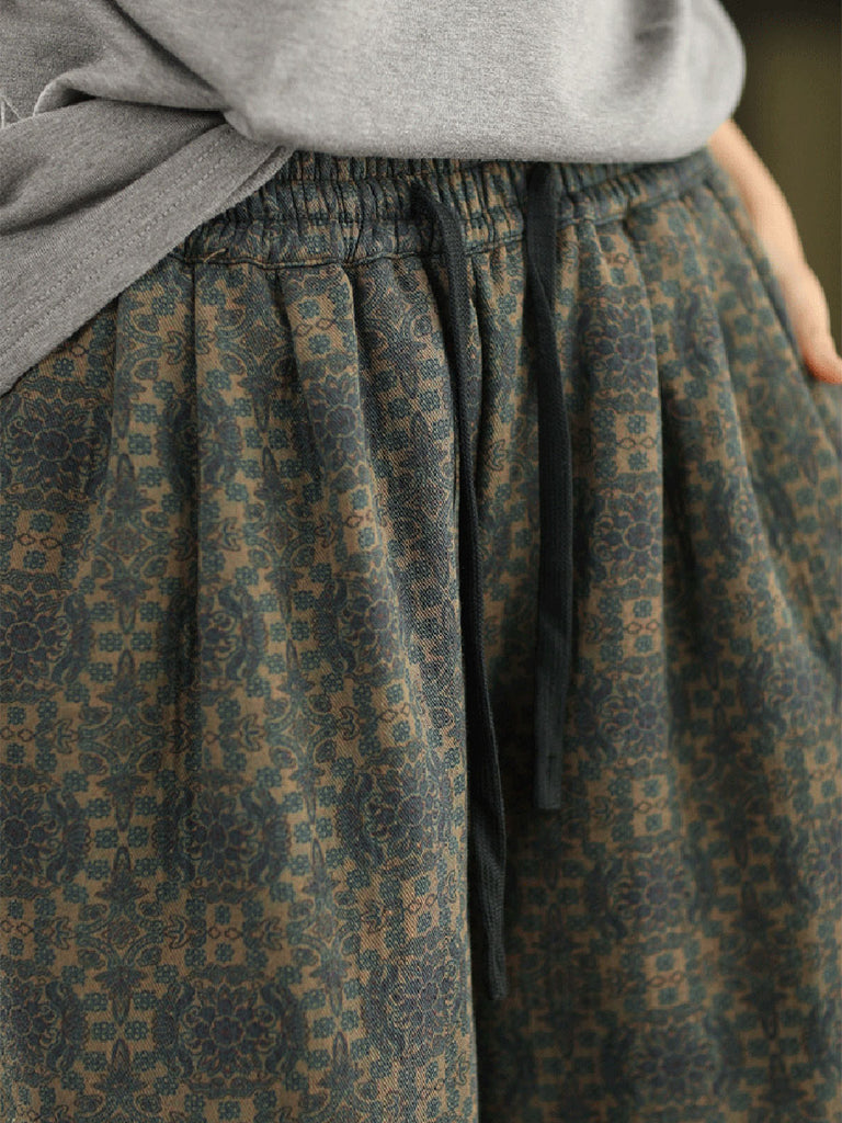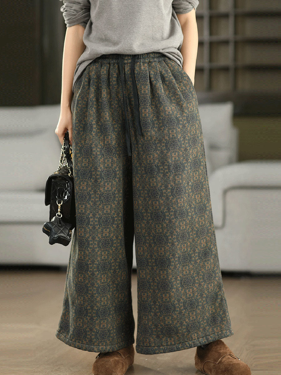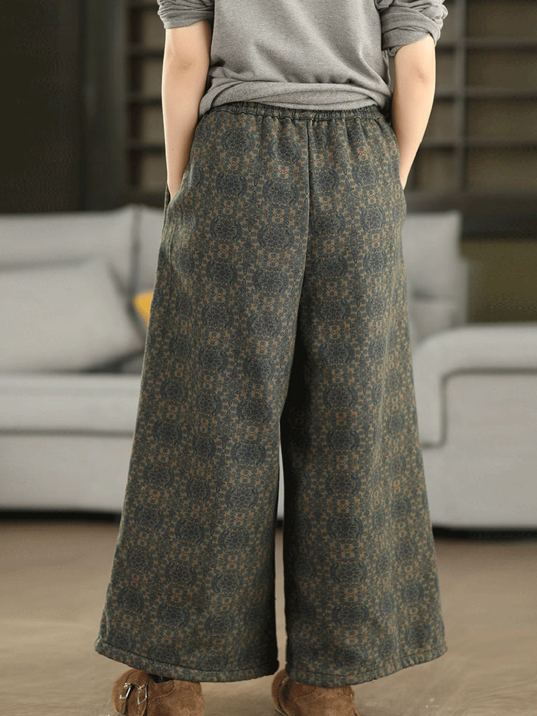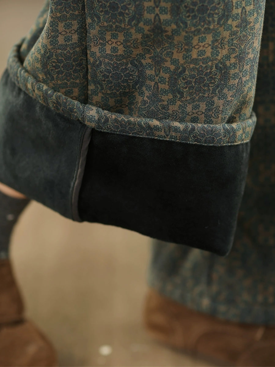 Damen Winter Retro Blumen Fleecegefütterte gerade Hose