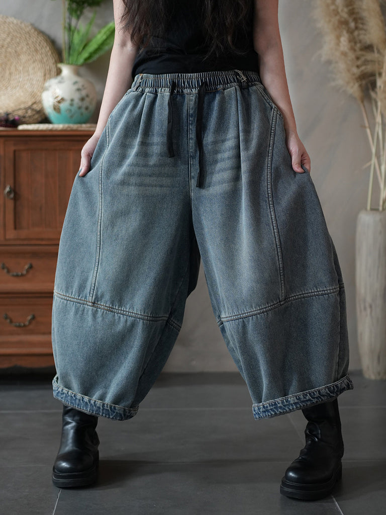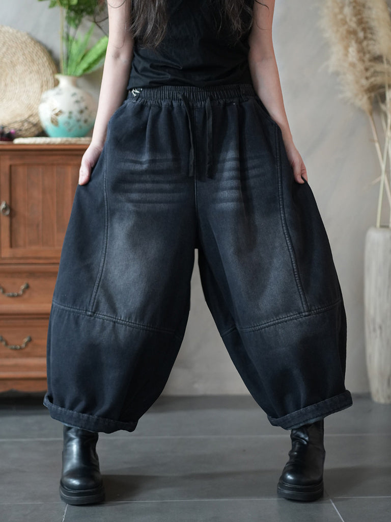 Damen Winter Retro Einfarbig Fleecegefütterte Denim Haremshose