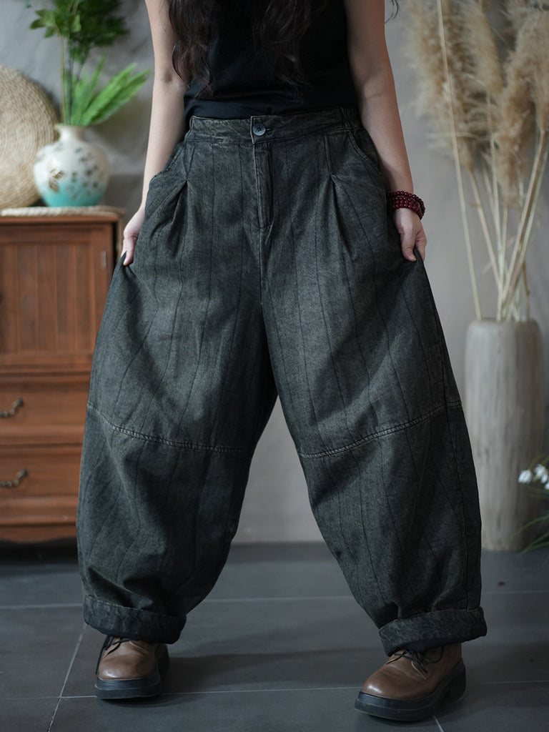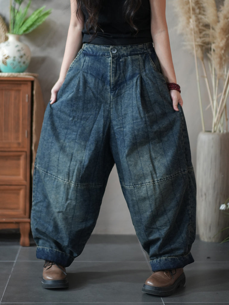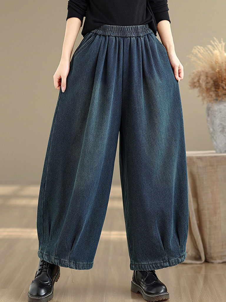 Damen Winter Retro Denim Fleecegefütterte Weitbeinhose