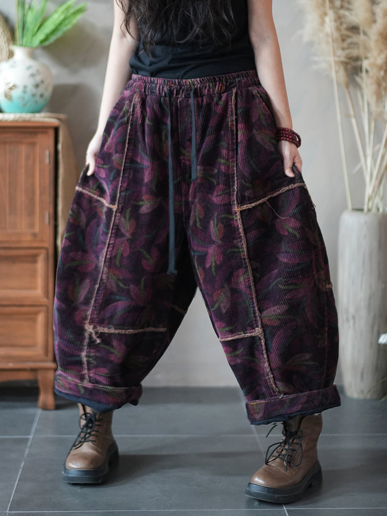 Damen Winter Retro Cord Haremshose mit Blumenmuster