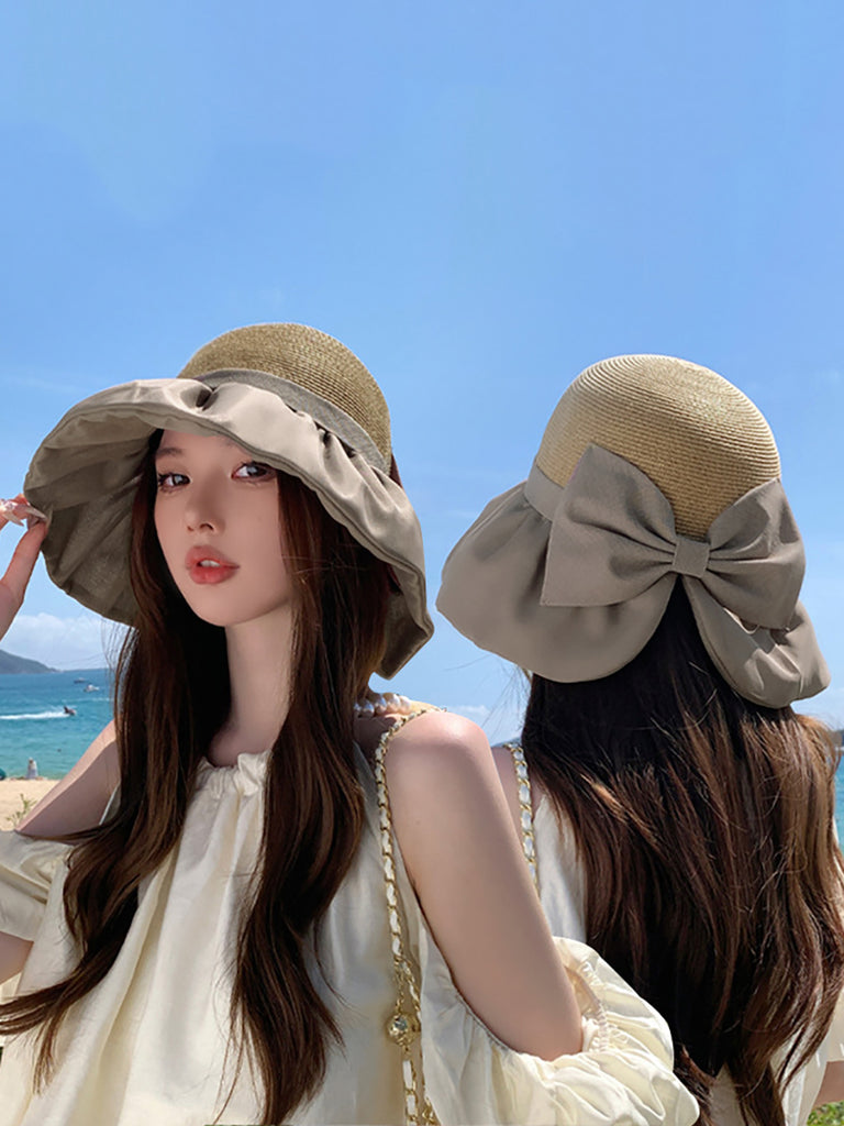 Damen Sommer Sonnenhut aus Stroh mit Schleife und Farbblock