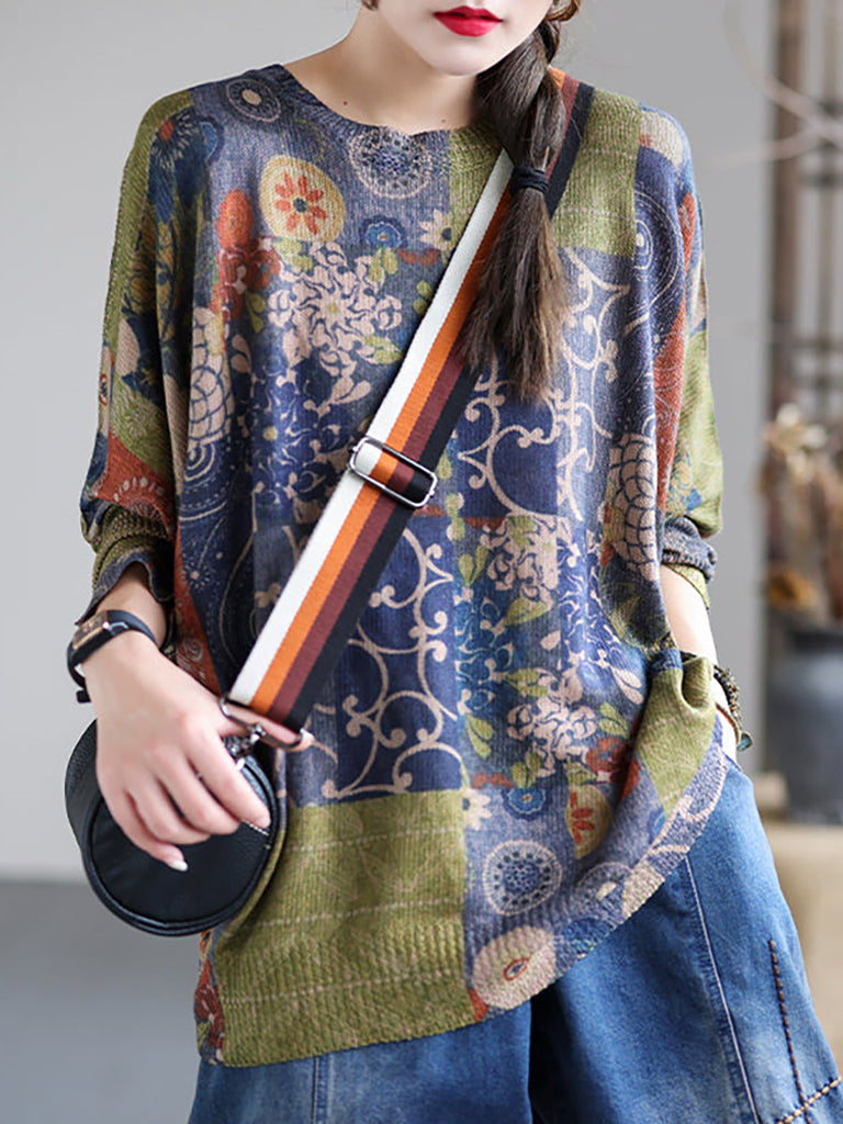 Damen Herbst Retro Blumen O-Ausschnitt Pullover