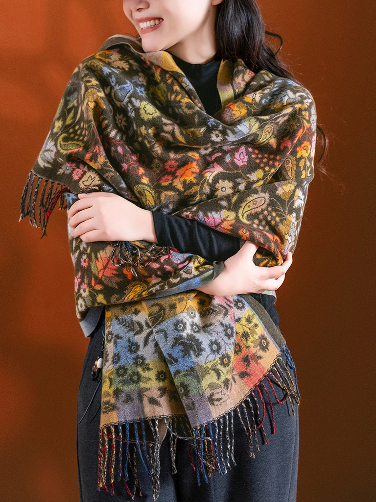 Damen Winter Vintage Blumen Colorblock Quaste Schal Schal