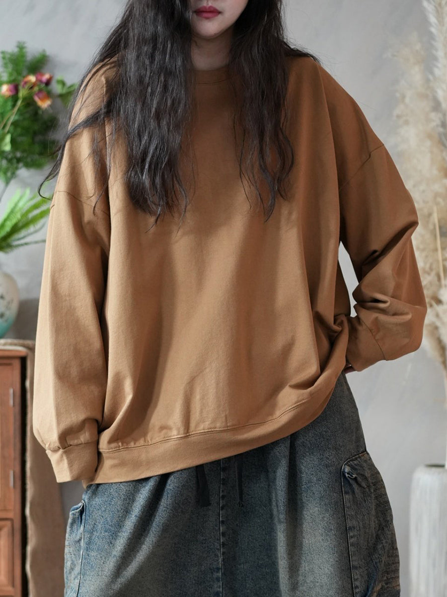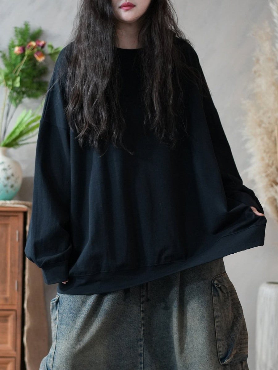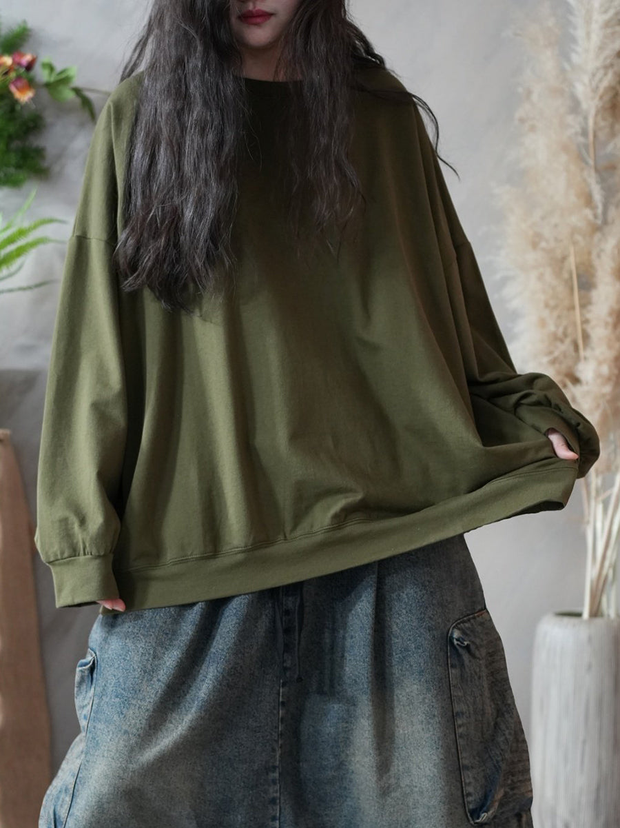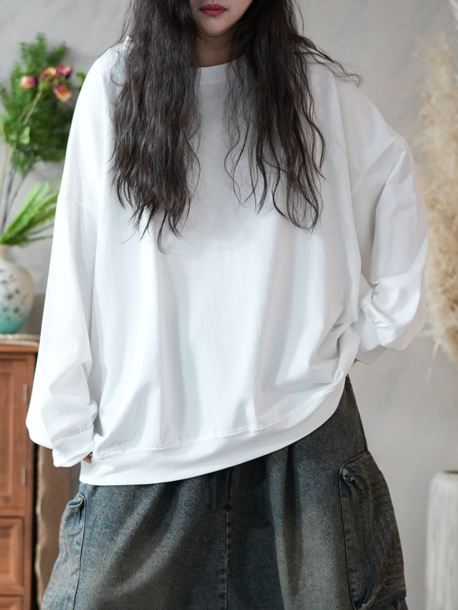 Frühlingsbluse für Damen, künstlerisch, einfarbig, 100 % Baumwolle, Rundhalsausschnitt