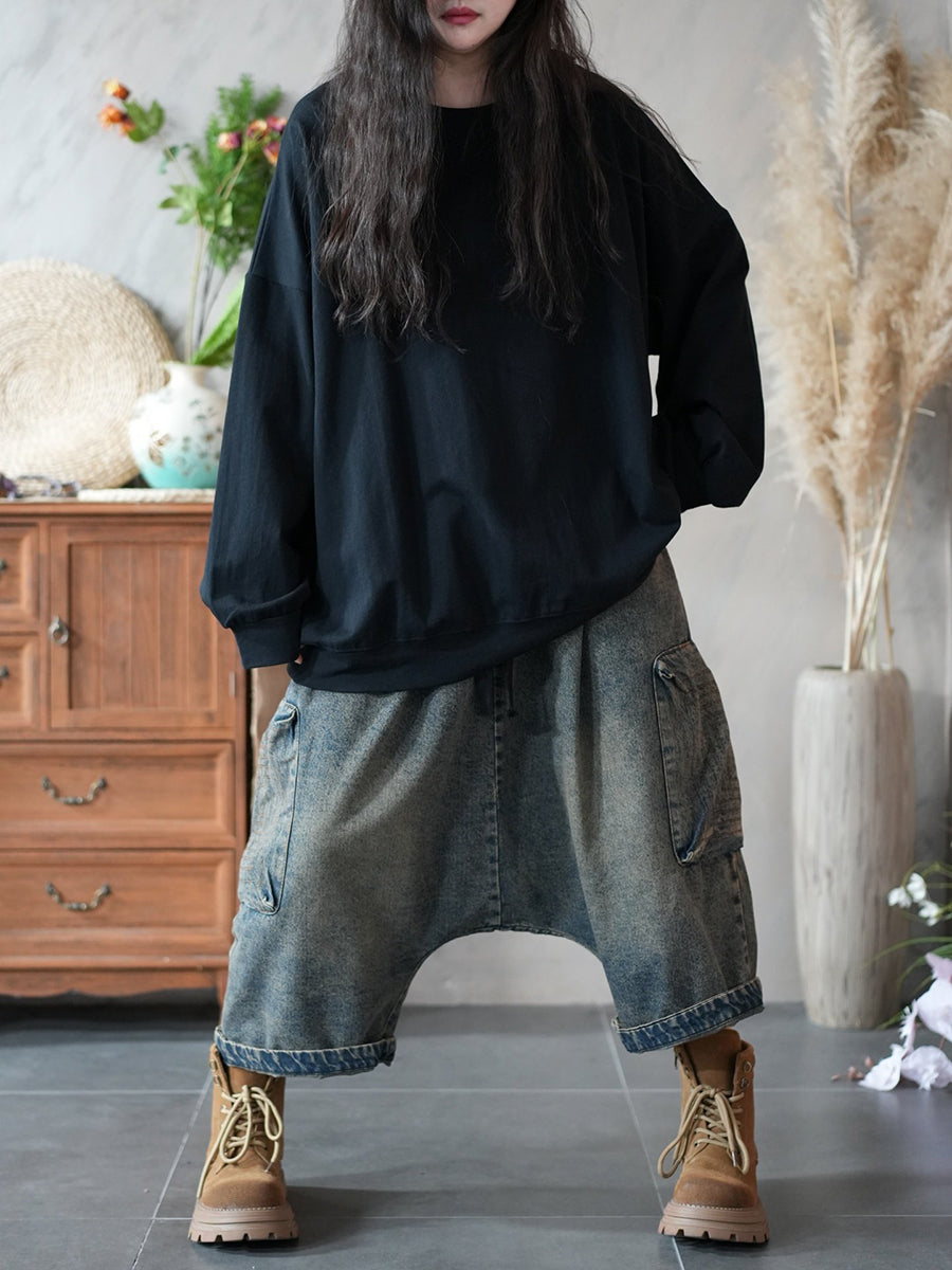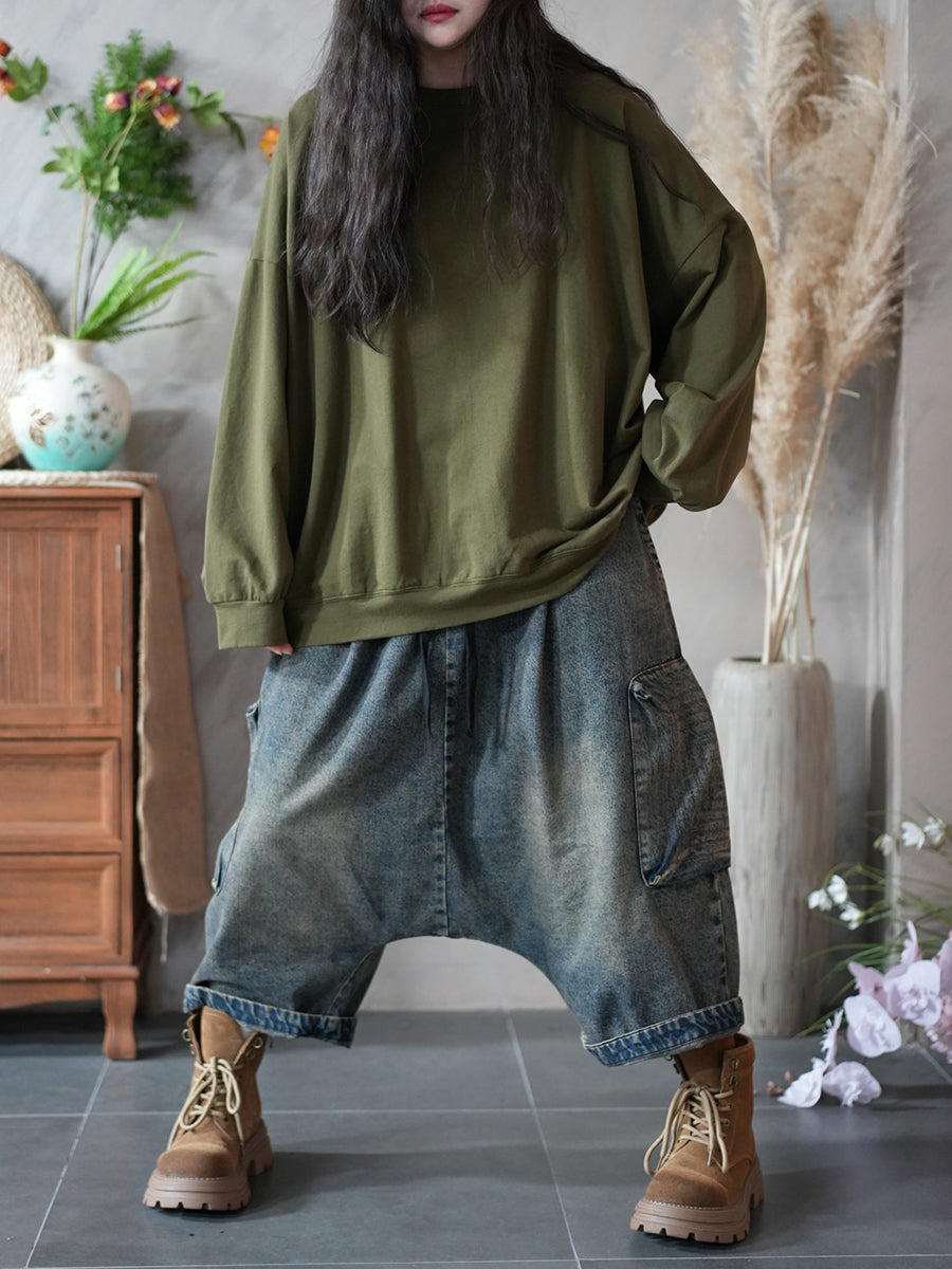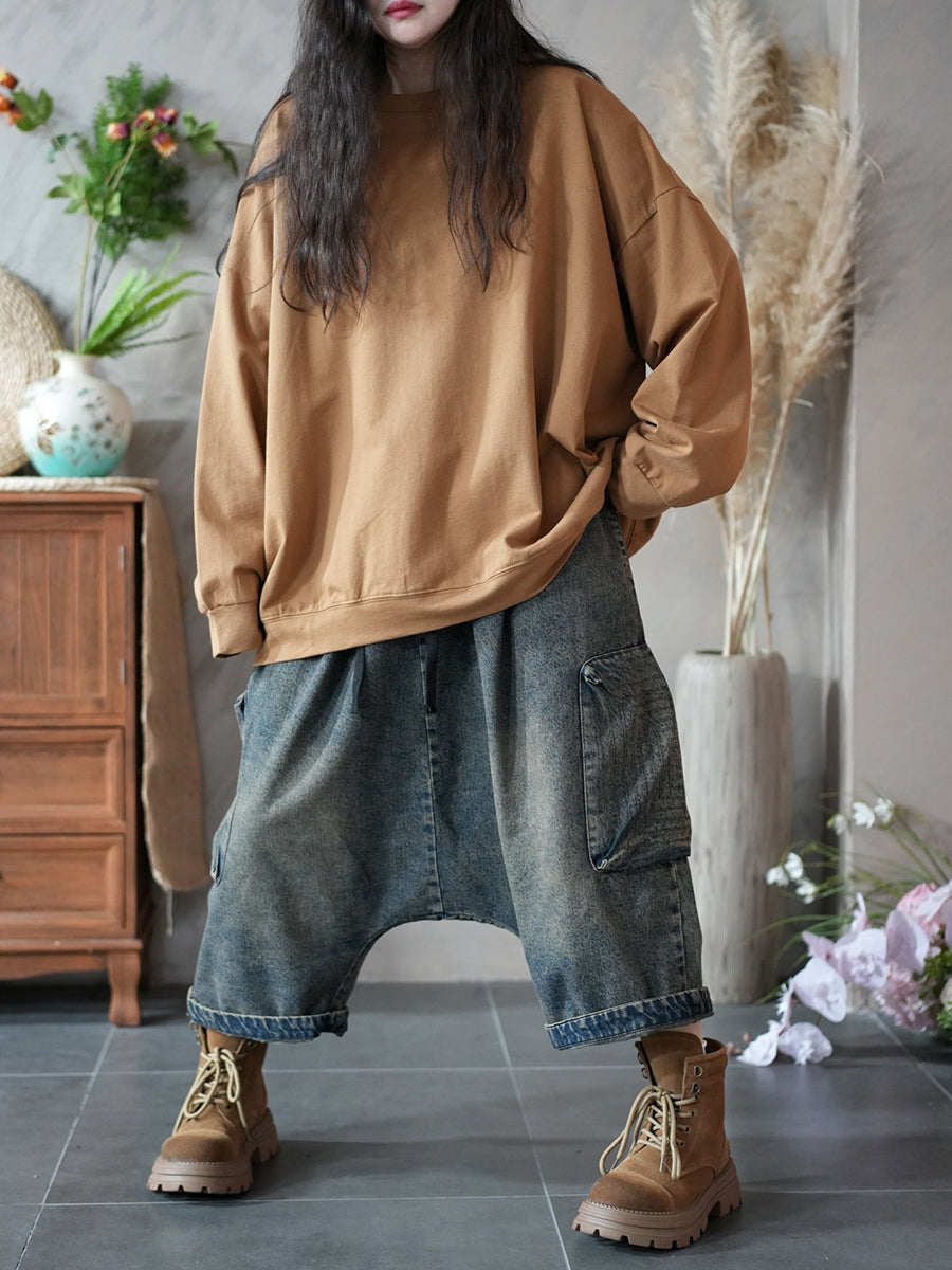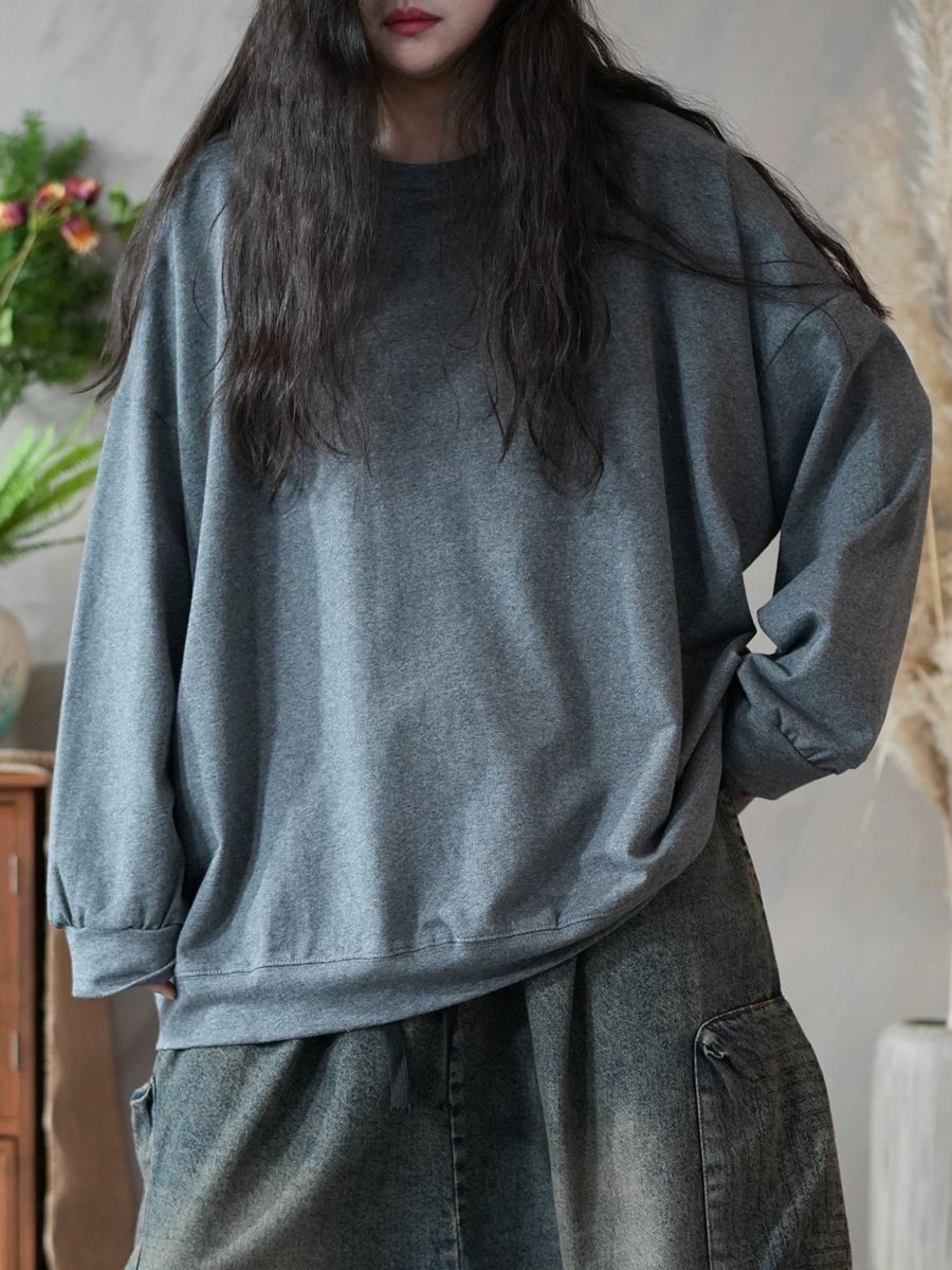 Frühlingsbluse für Damen, künstlerisch, einfarbig, 100 % Baumwolle, Rundhalsausschnitt