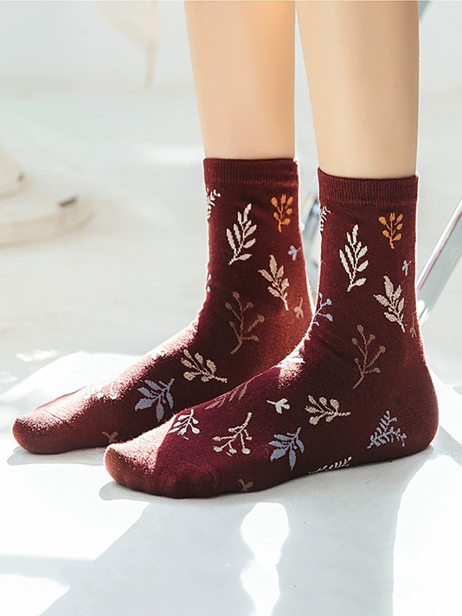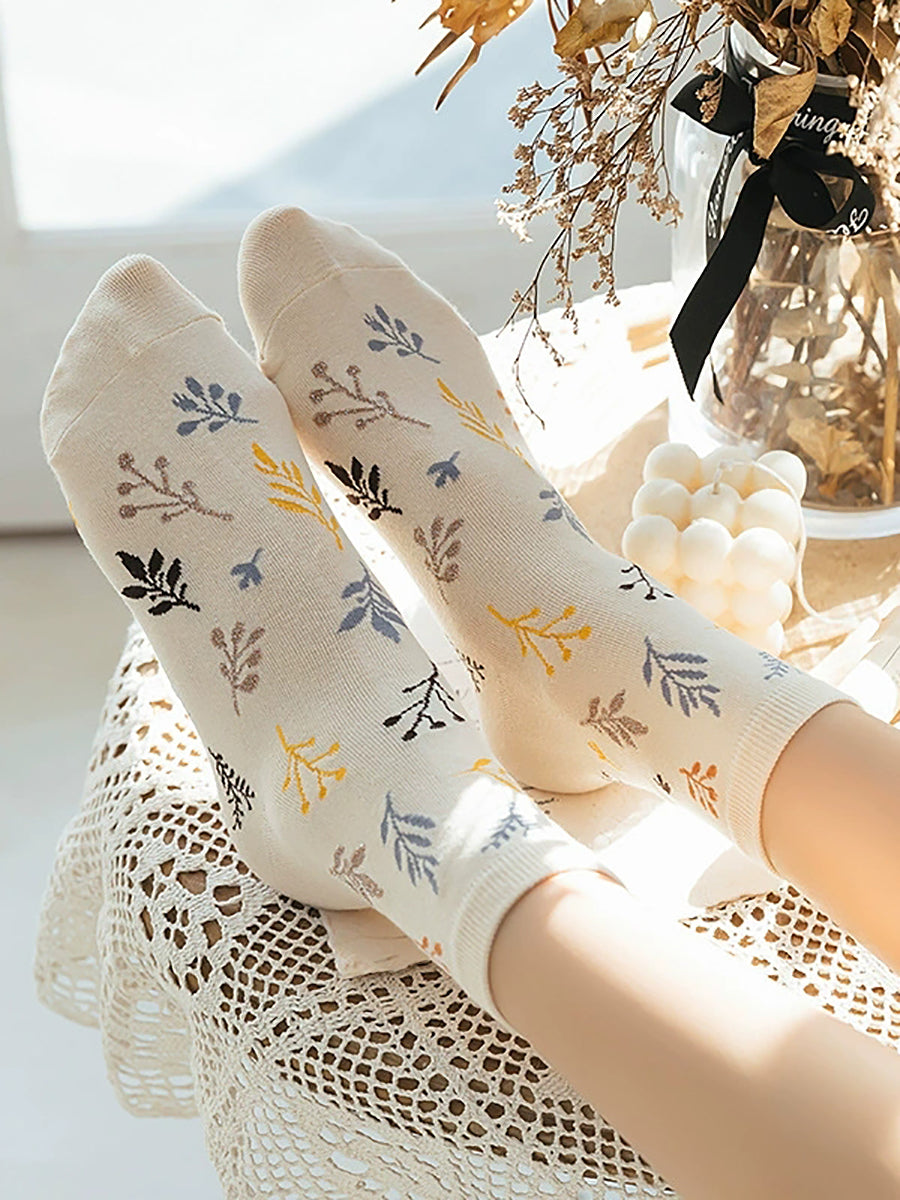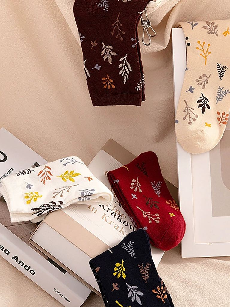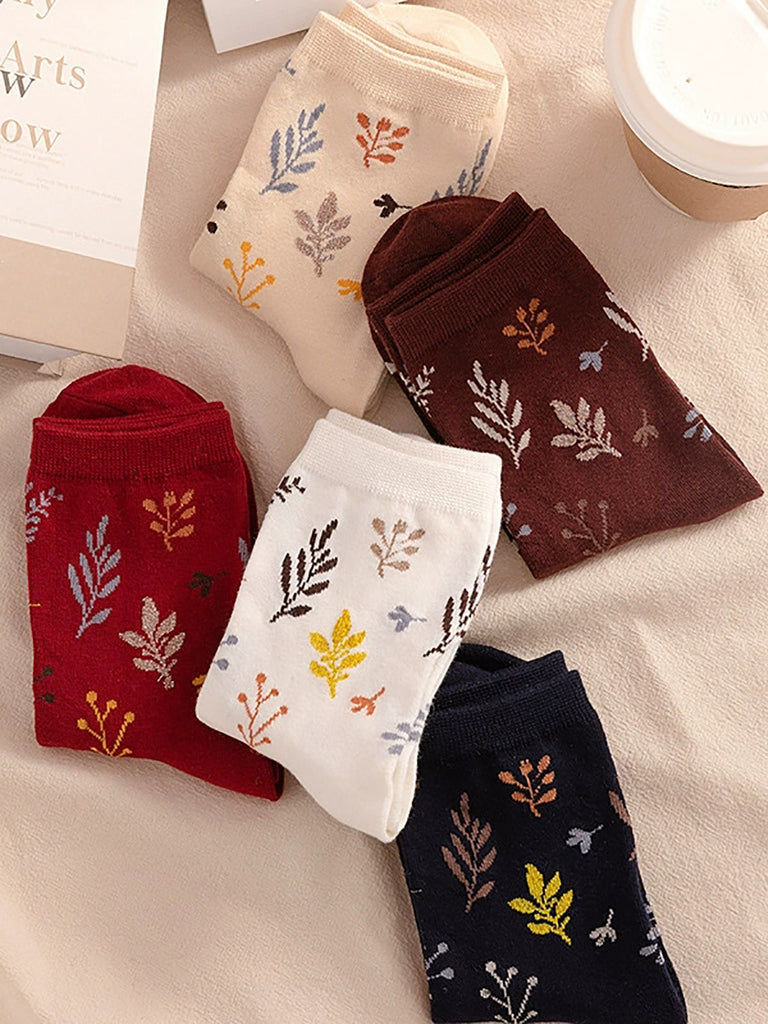 5 Paar Damen-Socken aus Baumwolle mit künstlerischem Vintage-Blattmuster