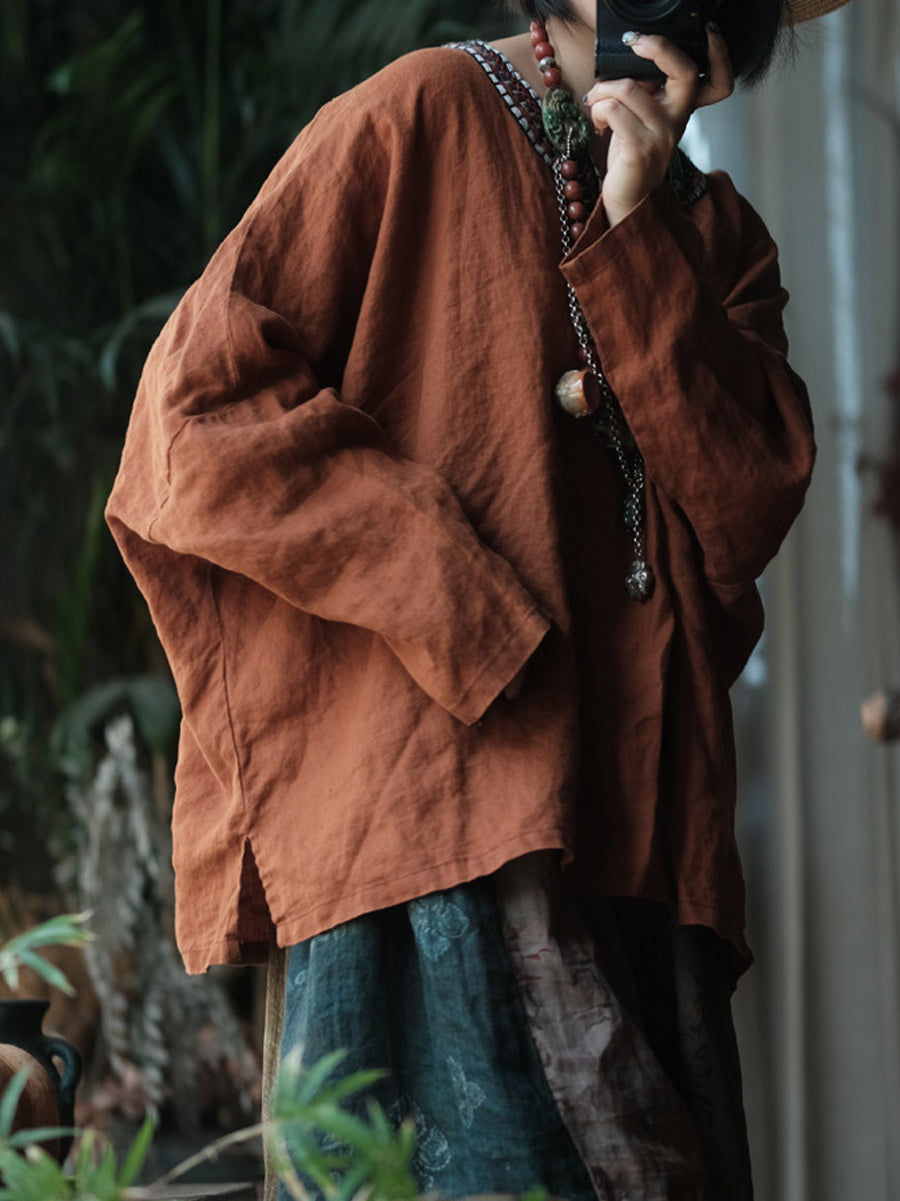 Damen Herbst Retro Stickerei V-Ausschnitt Leinenhemd