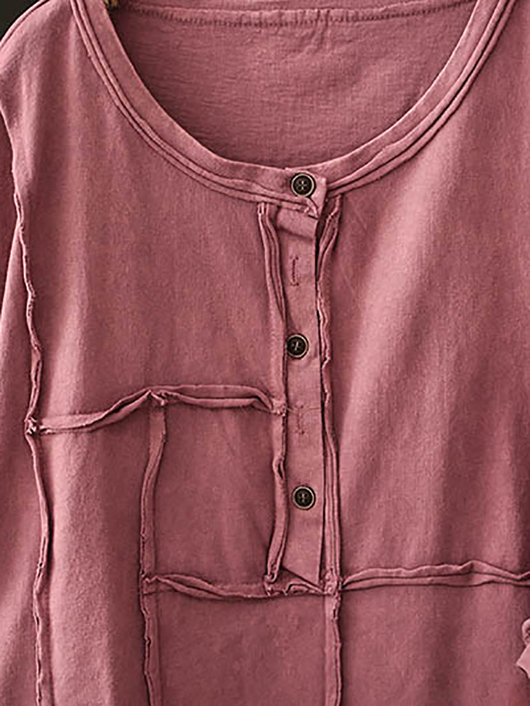 Damen Sommer Retro Reine Farbe O-Ausschnitt Baumwollhemd