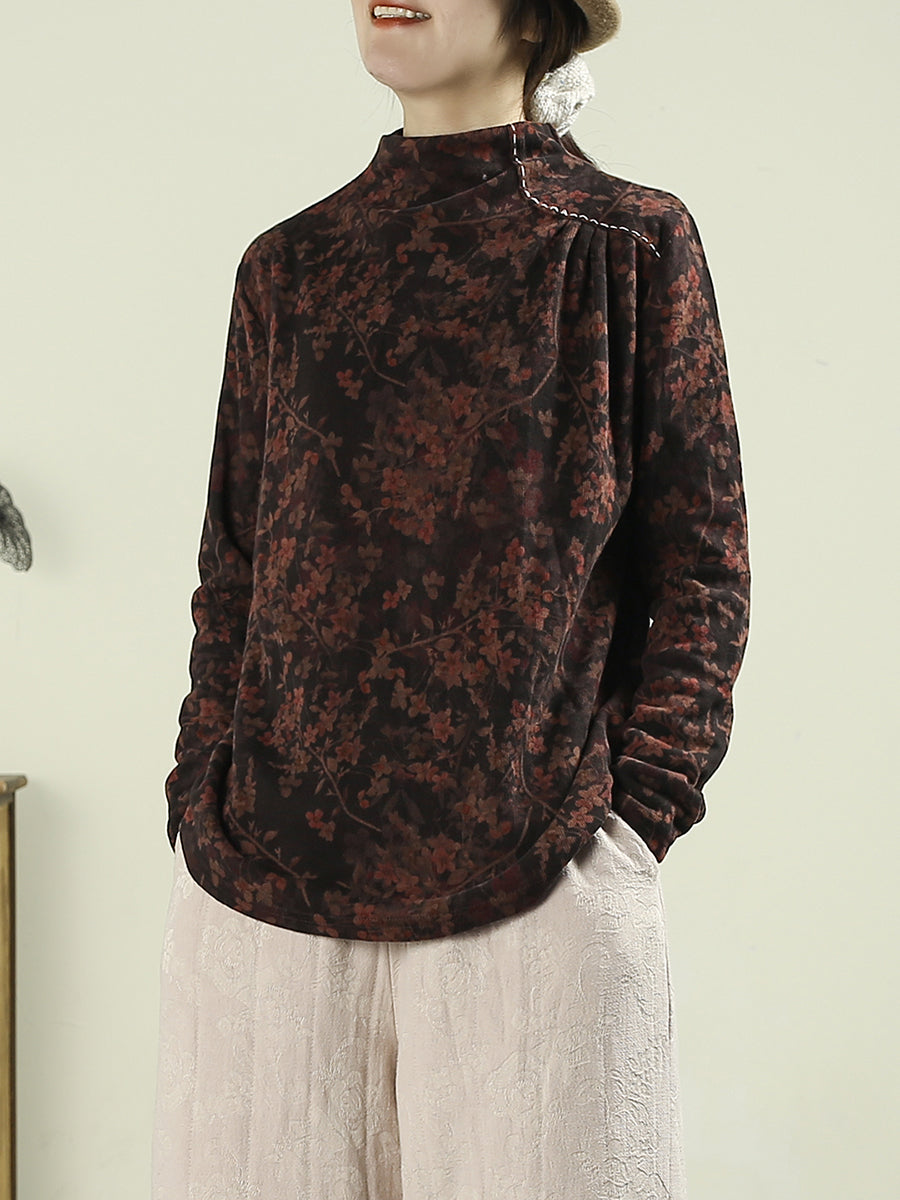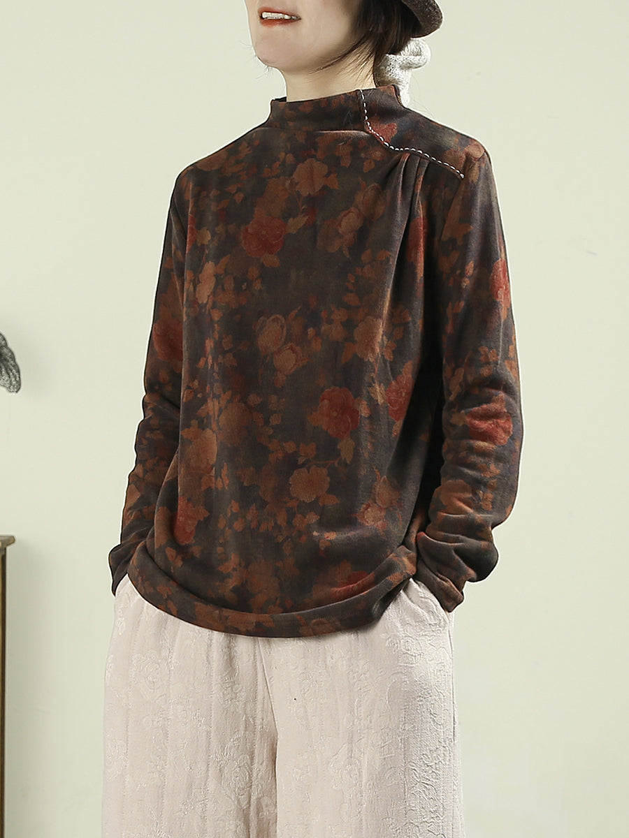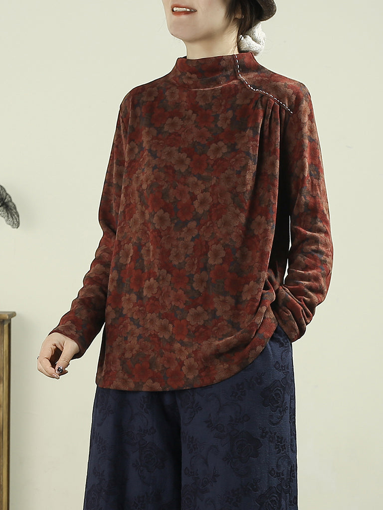 Vintage-Bluse mit Herbstblumenmuster und halben Rollkragen für Damen