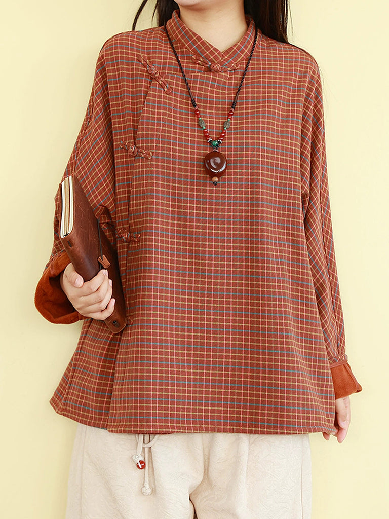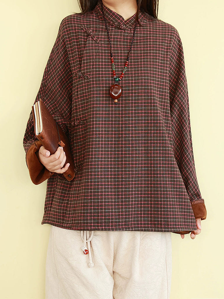 Damen Winterbluse im Ethno-Karo-Stil mit Stehkragen und Fleecefutter