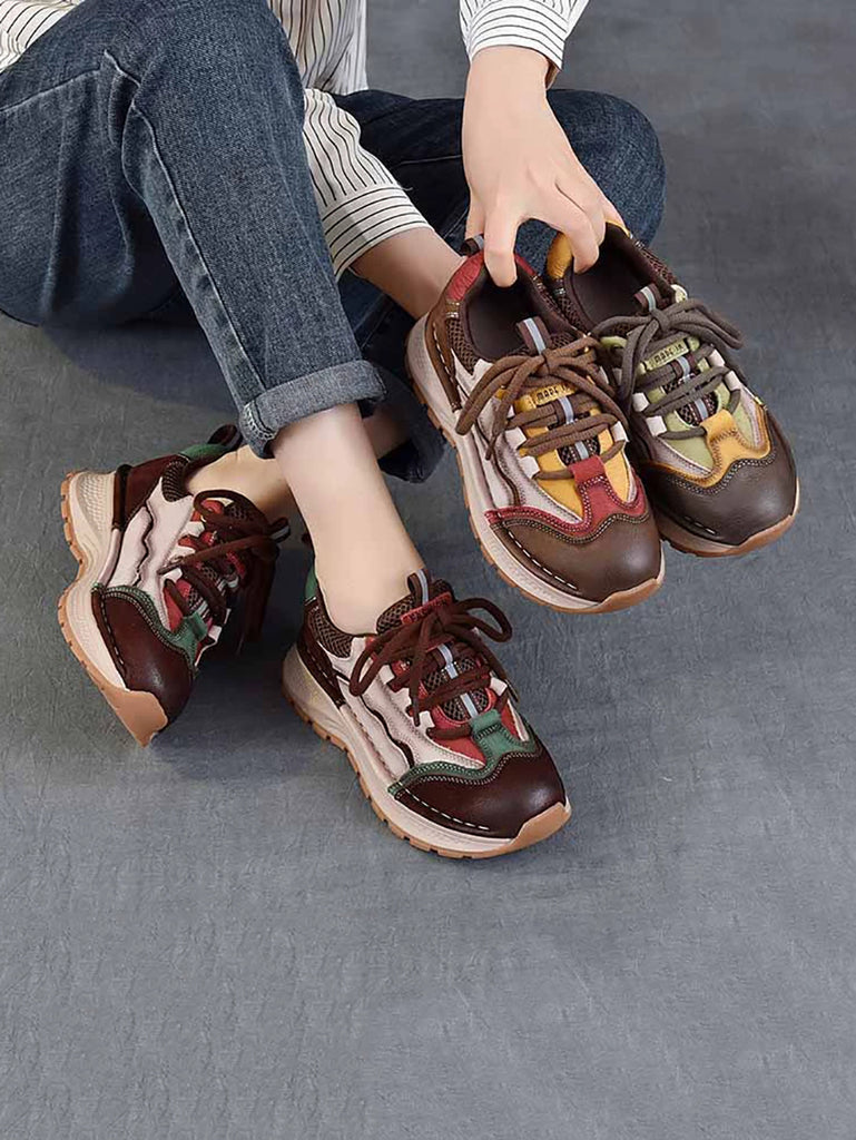 Damen Retro Colorblock Leder Sport Plateauschuhe
