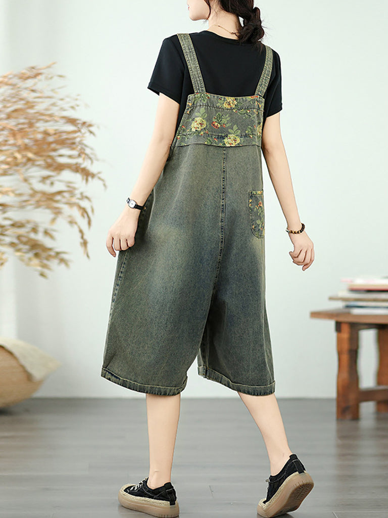 Women Summer Flower Spliced Denim Fifth Jumpsuits