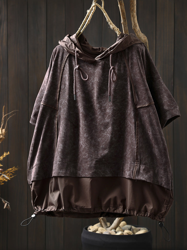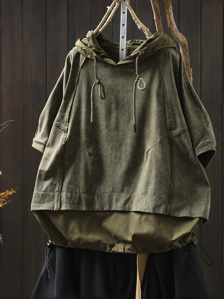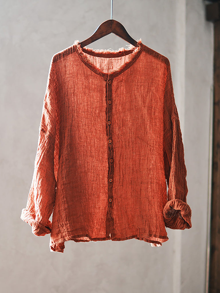Women Summer Retro Pure Color Raw-edge O-Neck Linen Shirt