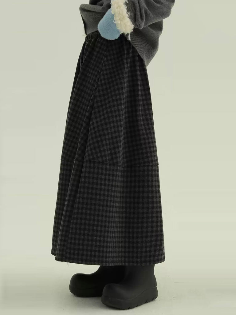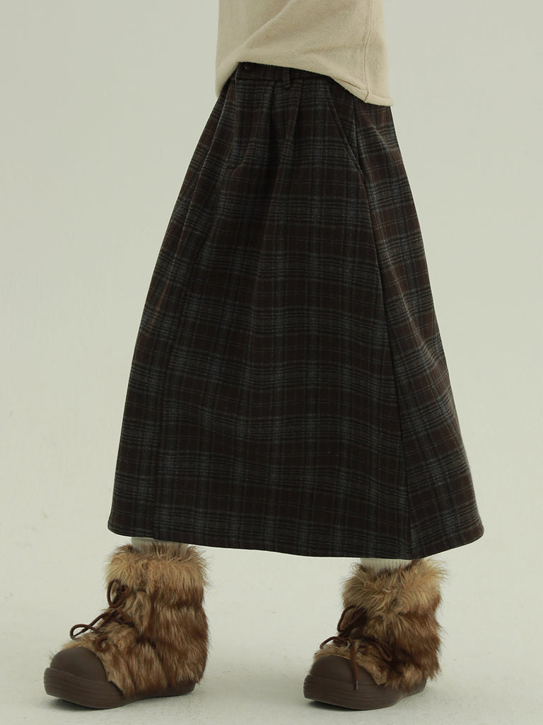 Women Winter Fleece-lined Plaid A-Shape Skirt
