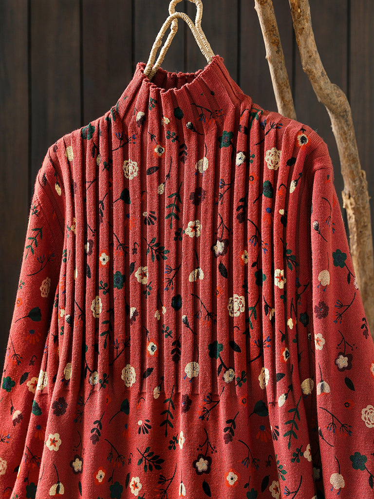 Women Autumn Vintage Floral Half-Turtleneck Knitted Dress