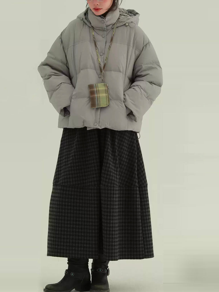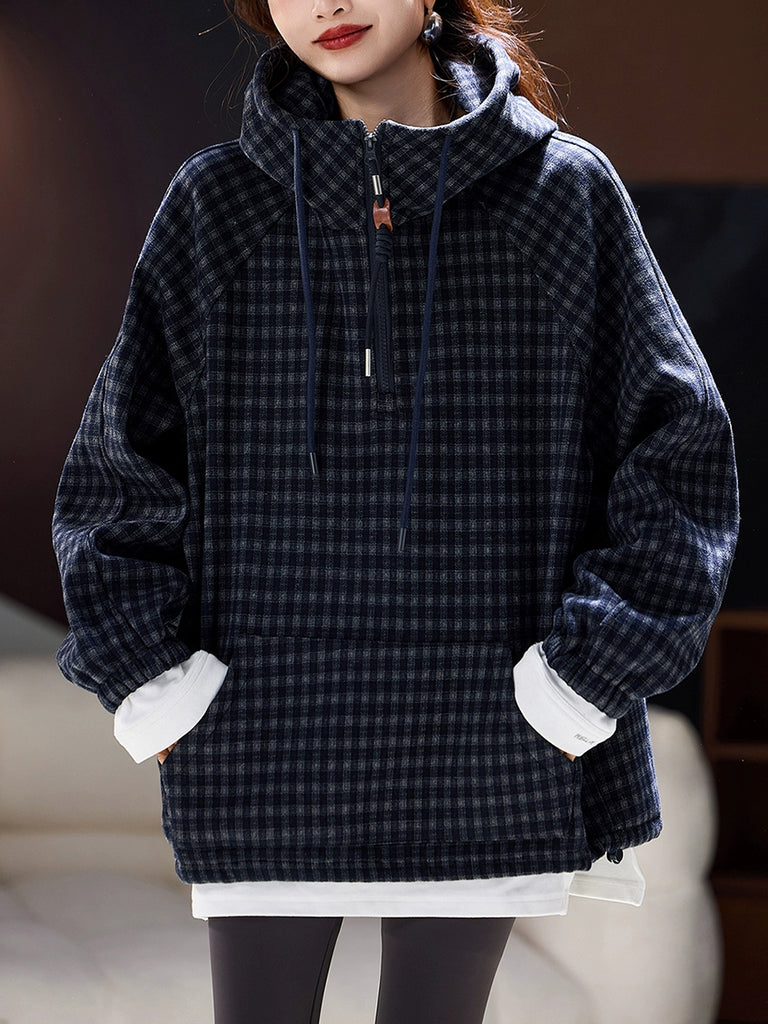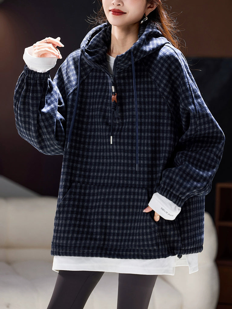 Women Winter Casual Plaid Fleece-lined Hooded Padded Coat