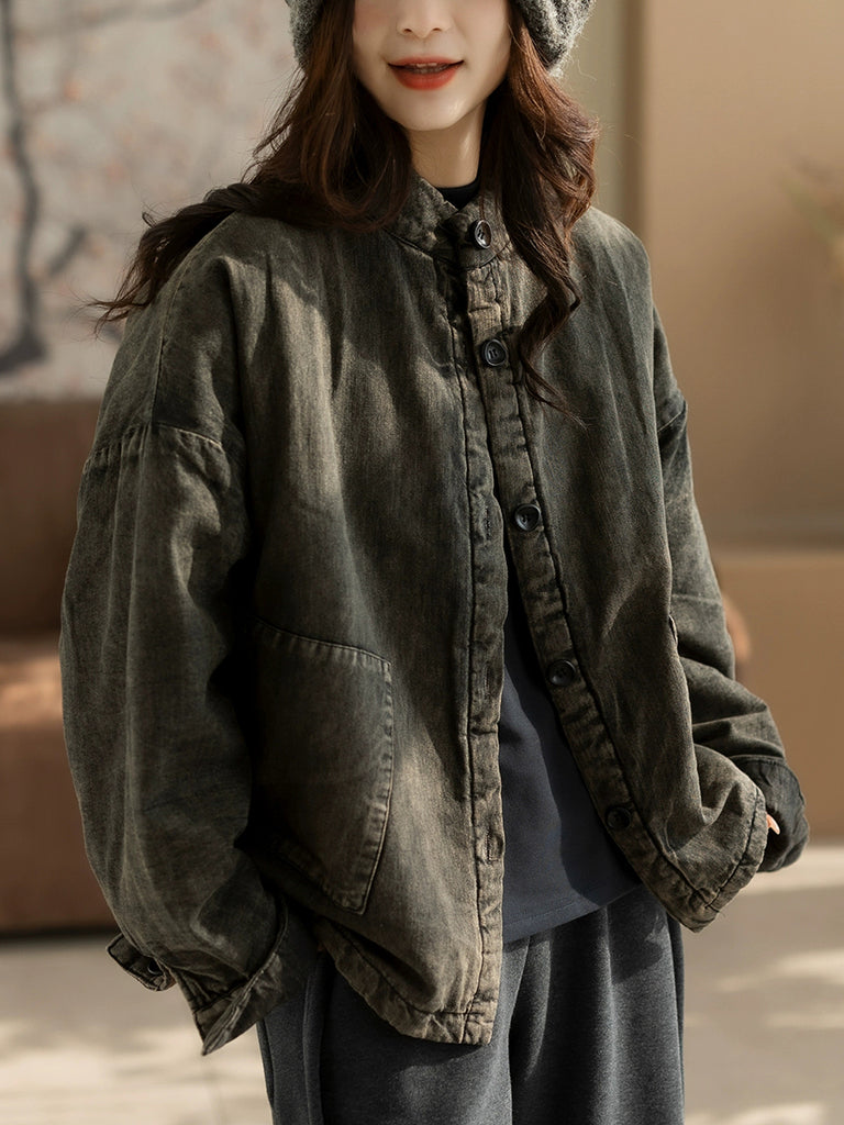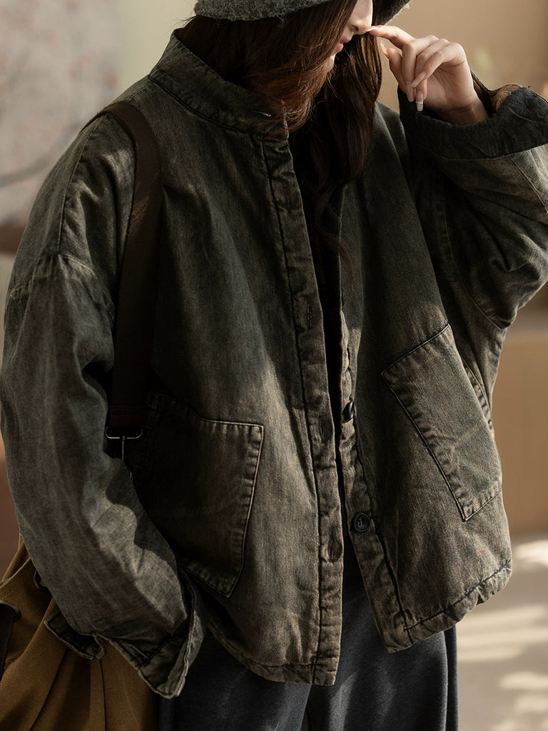 Women Winter Retro Pure Color Stand Collar Padded Coat