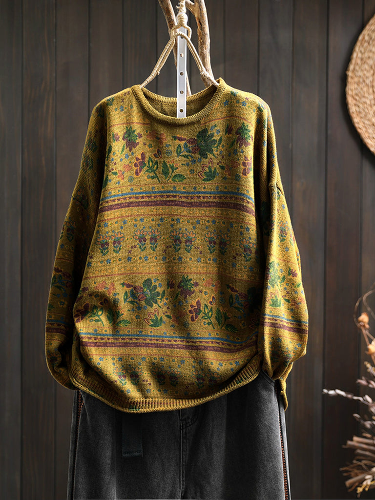 Women Autumn Artsy Flower Knitted O-Neck Sweater