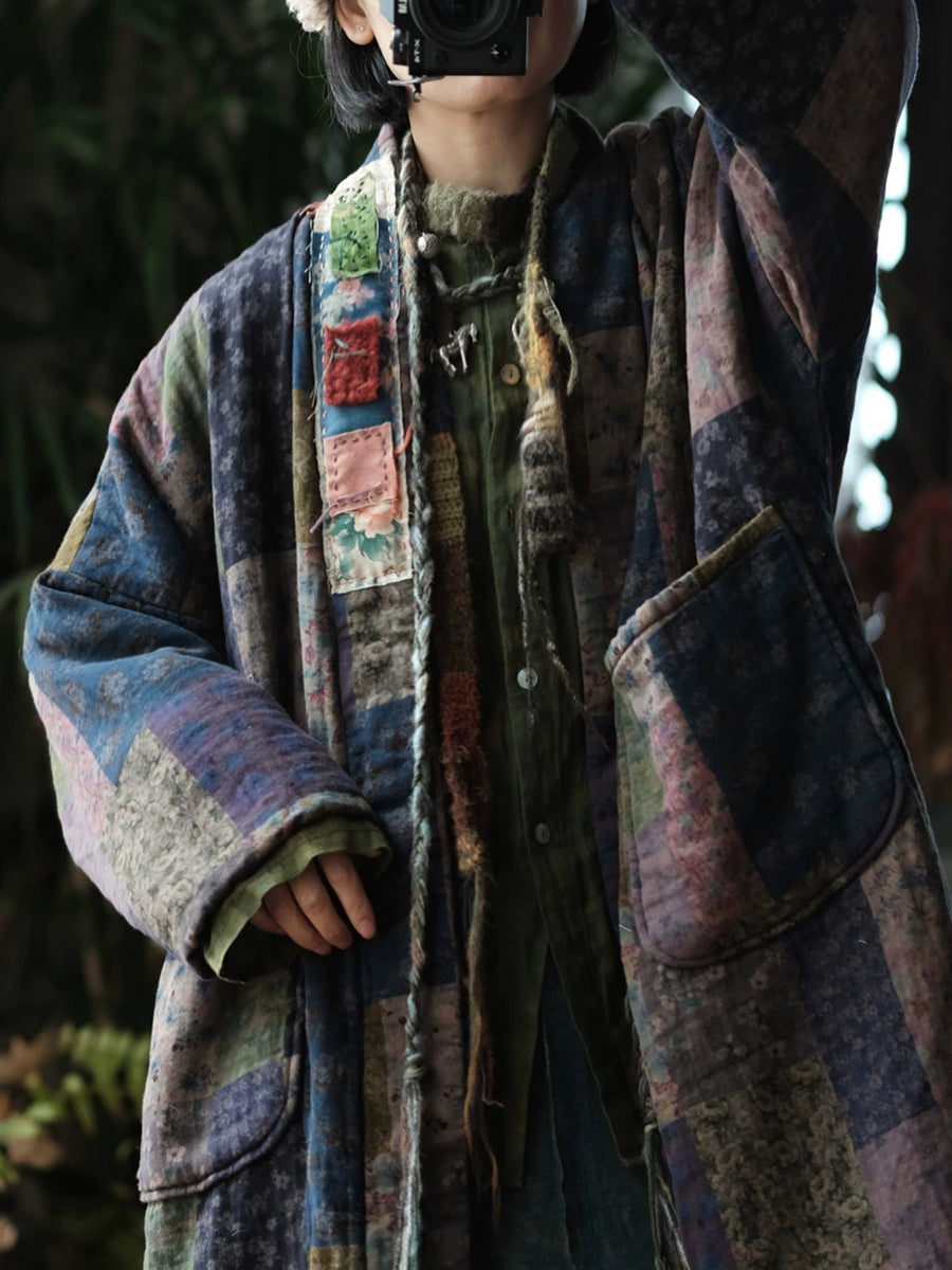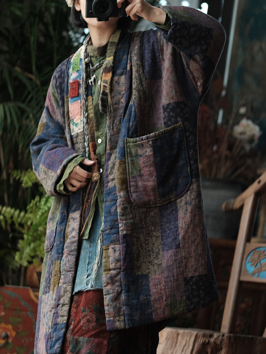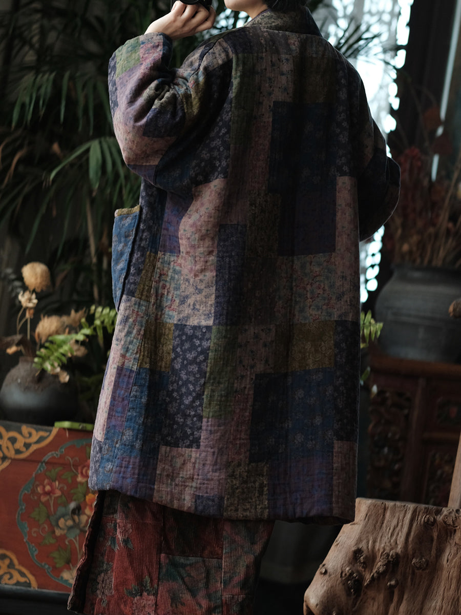 Women Retro Patchwork Cotton V-Neck Padded Coat