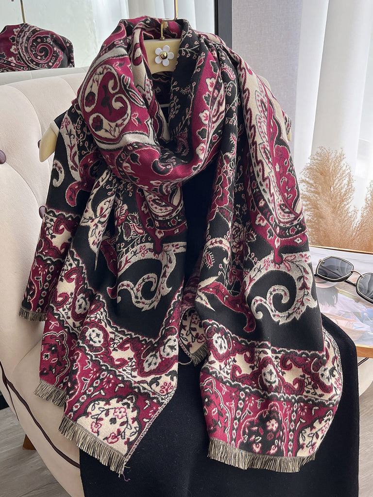 Women Winter Ethnic Flower Tassel Shawl Scarf