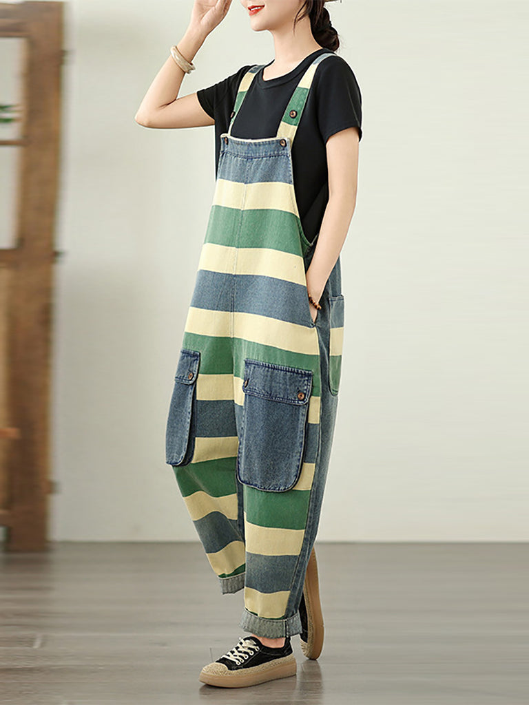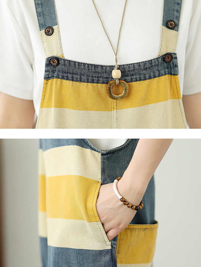 Women Summer Colorblock Stripe Denim Loose Jumpsuits