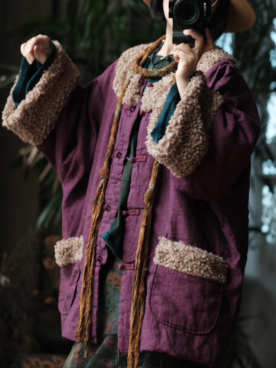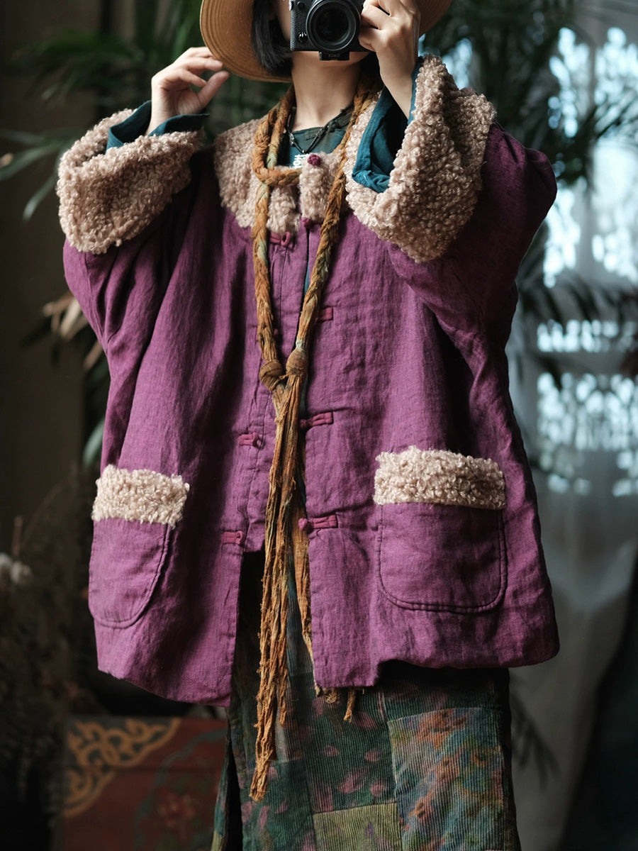 Women Winter Pure Color Fleece Spliced Cotton O-Neck Coat